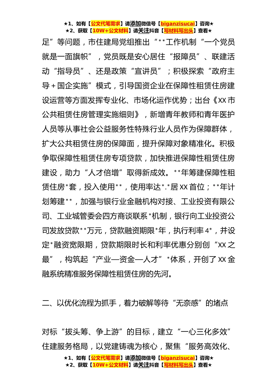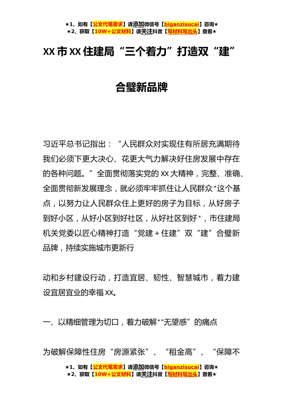★1、如有【公文代笔需求】请添加微信号【biganzisucai】咨询★★2、获取【10W+公文材料】请关注抖音【写材料写出头】查看★XX市XX住建局“三个着力”打造双“建”合璧新品牌习近平总书记指出:“人民群众对实现住有所居充满期待我们必须下更大决心、花更大气力解决好住房发展中存在的各种问题。”全面贯彻落实党的XX大精神,完整、准确、全面贯彻新发展理念,就必须牢牢抓住让人民群众*这个基点,以努力让人民群众住上更好的房子为目标,从好房子到好小区,从好小区到好社区,从好社区到好*,市住建局机关党委以匠心精神打造“党建+住建”双“建”合璧新品牌,持续实施城市更新行动和乡村建设行动,打造宜居、韧性、智慧城市,着力建设宜居宜业的幸福XX。一、以精细管理为切口,着力破解*“无望感”的痛点为破解...