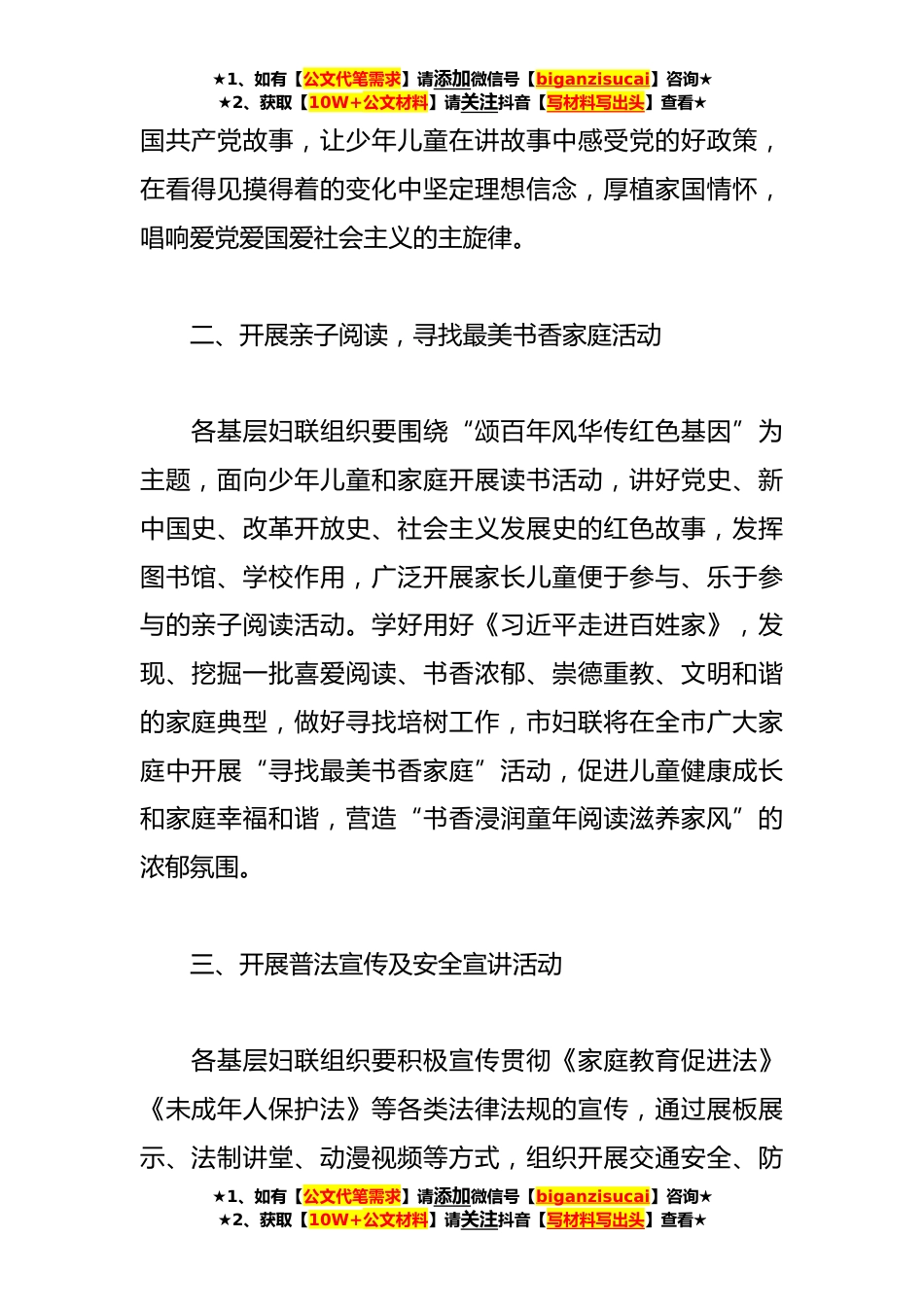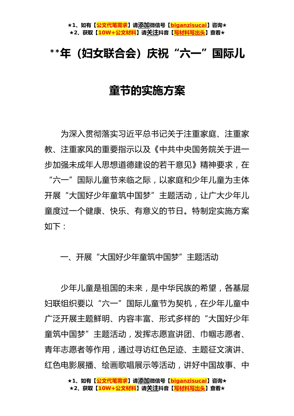 ★1、如有【公文代笔需求】请添加微信号【biganzisucai】咨询★★2、获取【10W+公文材料】请关注抖音【写材料写出头】查看★**年(妇女联合会)庆祝“六一”国际儿童节的实施方案为深入贯彻落实习近平总书记关于注重家庭、注重家教、注重家风的重要指示以及《中共中央国务院关于进一步加强未成年人思想道德建设的若干意见》精神要求,在“六一”国际儿童节来临之际,以家庭和少年儿童为主体开展“大国好少年童筑中国梦”主题活动,让广大少年儿童度过一个健康、快乐、有意义的节日。特制定实施方案如下:一、开展“大国好少年童筑中国梦”主题活动少年儿童是祖国的未来,是中华民族的希望,各基层妇联组织要以“六一”国际儿童节为契机,在少年儿童中广泛开展主题鲜明、内容丰富、形式多样的“大国好少年童筑中国...