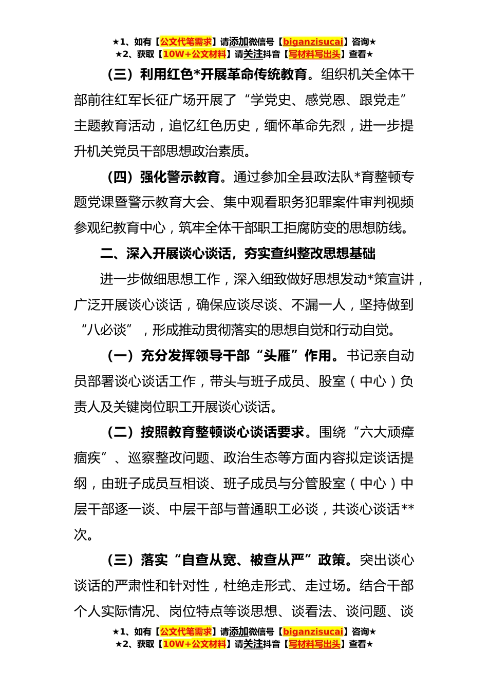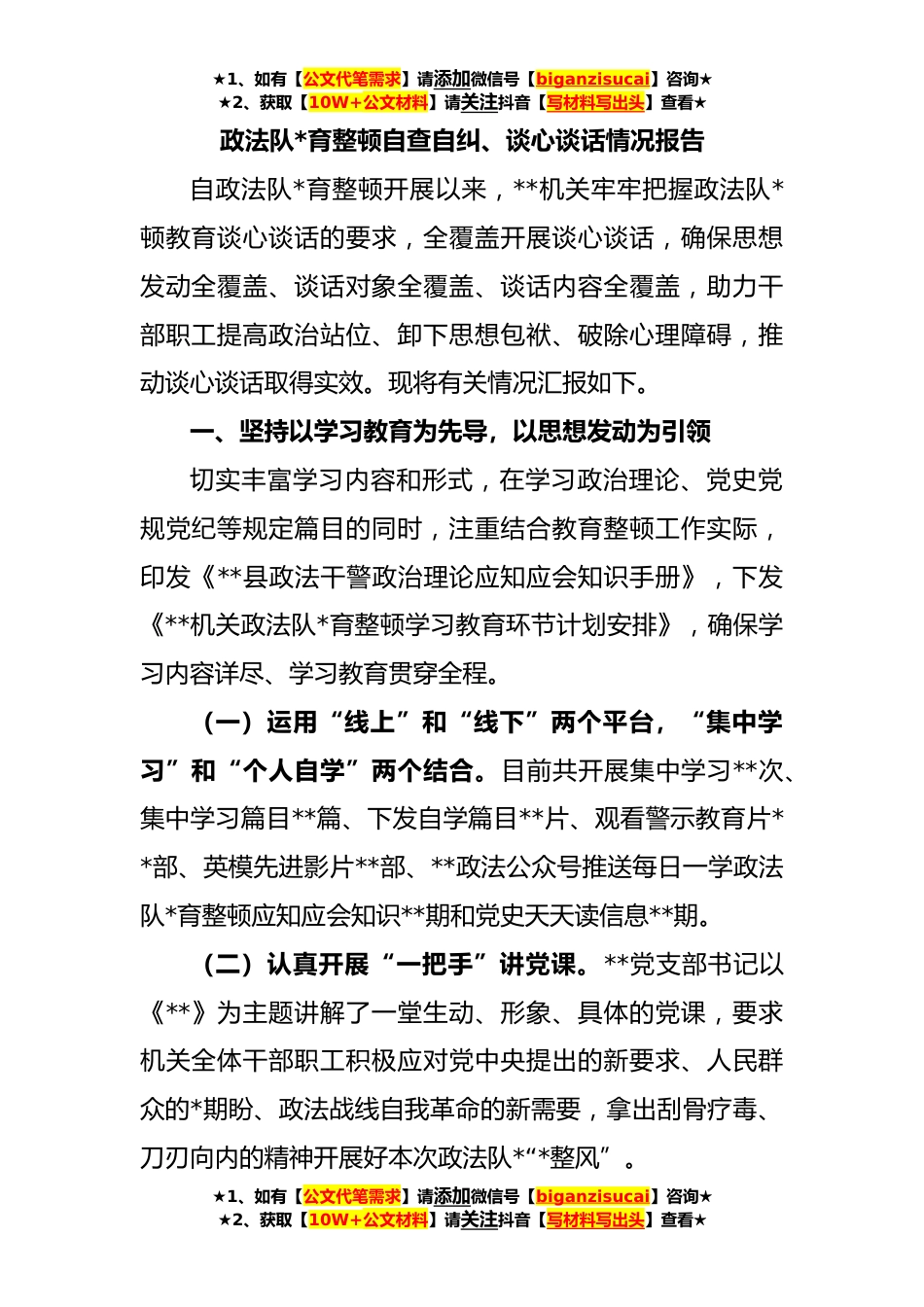 ★1、如有【公文代笔需求】请添加微信号【biganzisucai】咨询★★2、获取【10W+公文材料】请关注抖音【写材料写出头】查看★政法队*育整顿自查自纠、谈心谈话情况报告自政法队*育整顿开展以来,**机关牢牢把握政法队*顿教育谈心谈话的要求,全覆盖开展谈心谈话,确保思想发动全覆盖、谈话对象全覆盖、谈话内容全覆盖,助力干部职工提高政治站位、卸下思想包袱、破除心理障碍,推动谈心谈话取得实效。现将有关情况汇报如下。一、坚持以学习教育为先导,以思想发动为引领切实丰富学习内容和形式,在学习政治理论、党史党规党纪等规定篇目的同时,注重结合教育整顿工作实际,印发《**县政法干警政治理论应知应会知识手册》,下发《**机关政法队*育整顿学习教育环节计划安排》,确保学习内容详尽、学习教育贯穿全程。...