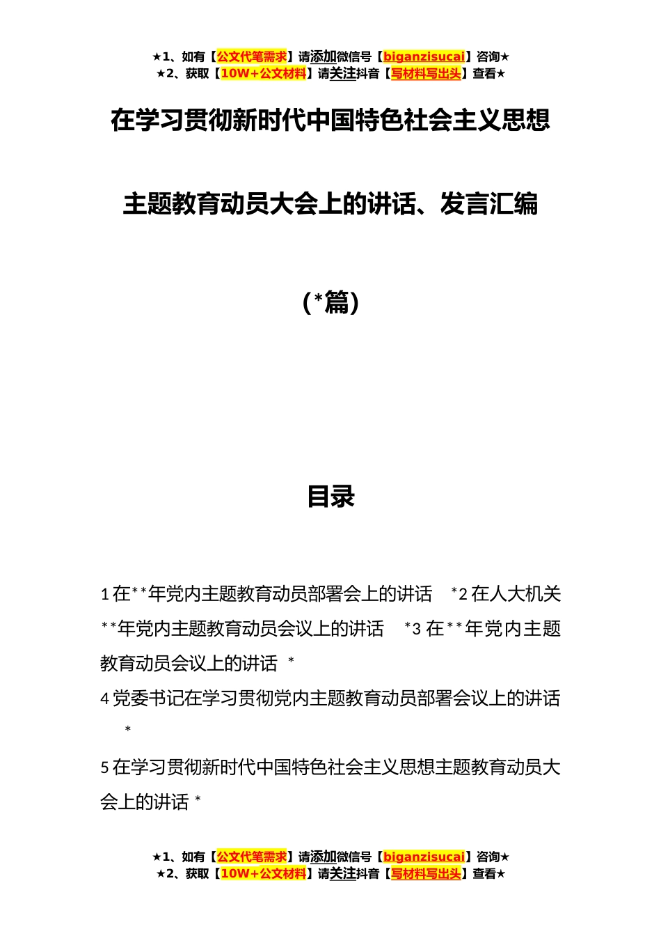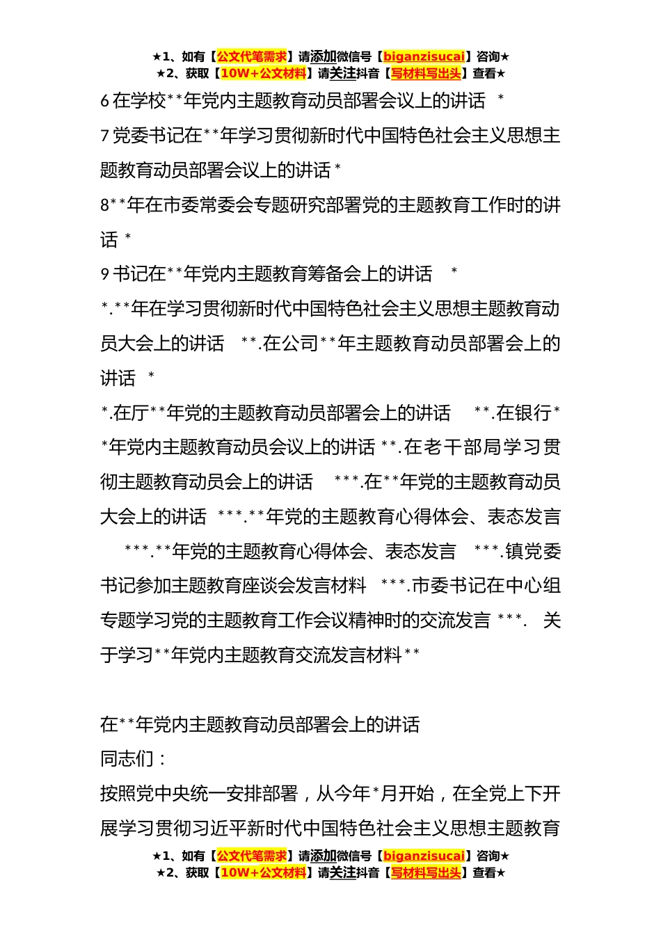 ★1、如有【公文代笔需求】请添加微信号【biganzisucai】咨询★★2、获取【10W+公文材料】请关注抖音【写材料写出头】查看★在学习贯彻新时代中国特色社会主义思想主题教育动员大会上的讲话、发言汇编(*篇)目录1在**年党内主题教育动员部署会上的讲话*2在人大机关**年党内主题教育动员会议上的讲话*3在**年党内主题教育动员会议上的讲话*4党委书记在学习贯彻党内主题教育动员部署会议上的讲话*5在学习贯彻新时代中国特色社会主义思想主题教育动员大会上的讲话*★1、如有【公文代笔需求】请添加微信号【biganzisucai】咨询★★2、获取【10W+公文材料】请关注抖音【写材料写出头】查看★★1、如有【公文代笔需求】请添加微信号【biganzisucai】咨询★★2、获取【10W+公文材料】请关注抖音【写材料写出头】查看★6...