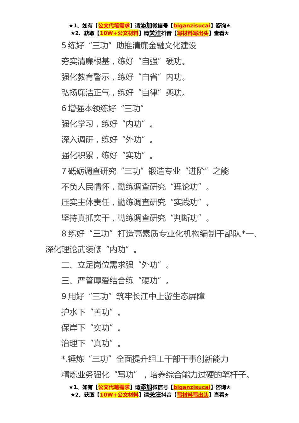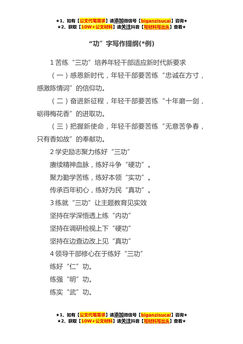 ★1、如有【公文代笔需求】请添加微信号【biganzisucai】咨询★★2、获取【10W+公文材料】请关注抖音【写材料写出头】查看★“功”字写作提纲(*例)1苦练“三功”培养年轻干部适应新时代新要求(一)感恩新时代,年轻干部要苦练“忠诚在方寸,感激陈情词”的信仰功。(二)奋进新征程,年轻干部要苦练“十年磨一剑,砺得梅花香”的进取功。(三)把握新使命,年轻干部要苦练“无意苦争春,只有香如故”的奉献功。2学史励志聚力练好“三功”赓续精神血脉,练好斗争“硬功”。聚力勤学苦练,练好本领“实功”。传承百年初心,练好为民“真功”。3练就“三功”让主题教育见实效坚持在学深悟透上练“内功”坚持在调研检视上下“硬功”坚持在边查边改上见“真功”4领导干部修心在于练好“三功”练好“仁”功。练强“明”...