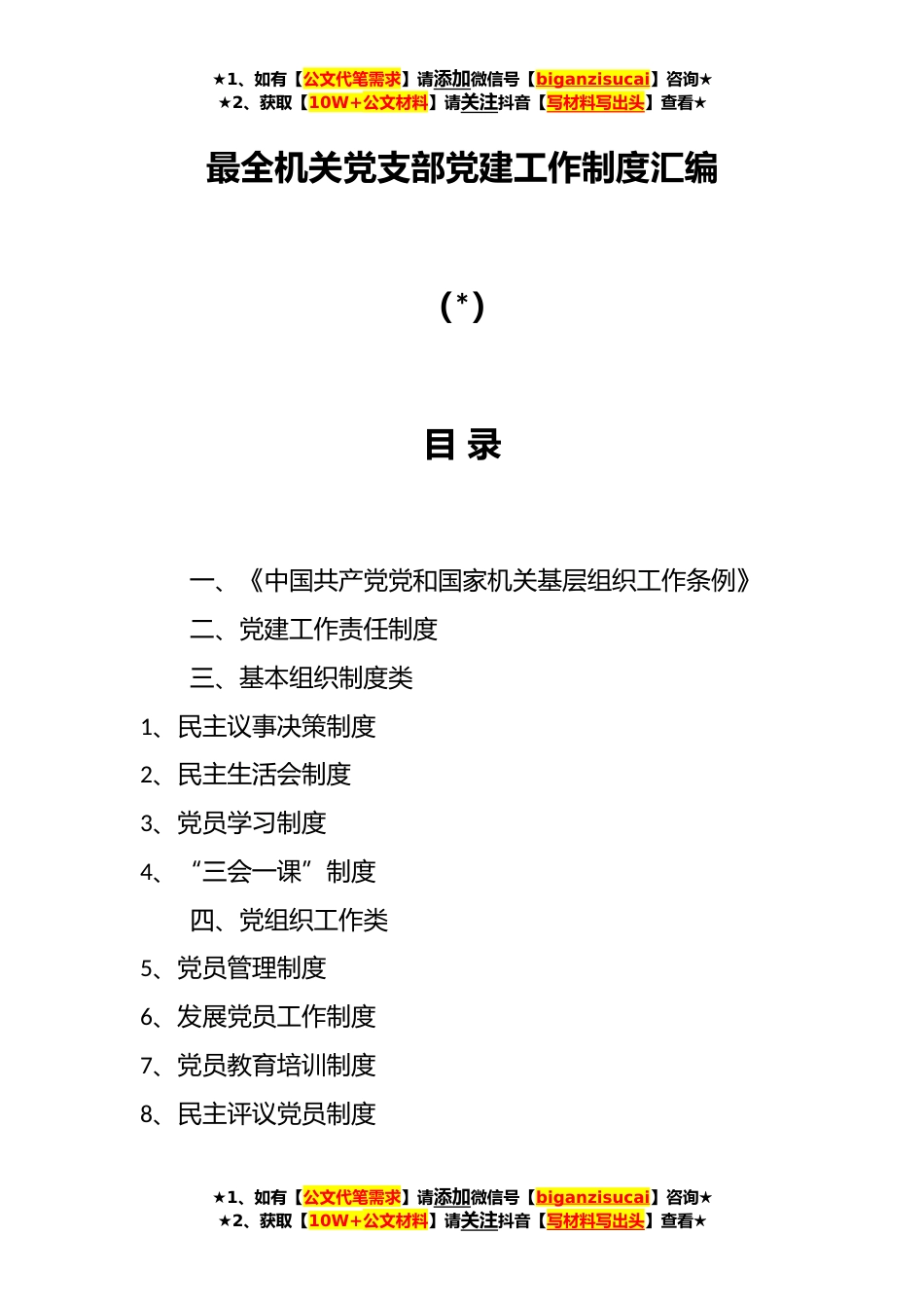 ★1、如有【公文代笔需求】请添加微信号【biganzisucai】咨询★★2、获取【10W+公文材料】请关注抖音【写材料写出头】查看★最全机关党支部党建工作制度汇编(*)目录一、《中国共产党党和国家机关基层组织工作条例》二、党建工作责任制度三、基本组织制度类1、民主议事决策制度2、民主生活会制度3、党员学习制度4、“三会一课”制度四、党组织工作类5、党员管理制度6、发展党员工作制度7、党员教育培训制度8、民主评议党员制度★1、如有【公文代笔需求】请添加微信号【biganzisucai】咨询★★2、获取【10W+公文材料】请关注抖音【写材料写出头】查看★★1、如有【公文代笔需求】请添加微信号【biganzisucai】咨询★★2、获取【10W+公文材料】请关注抖音【写材料写出头】查看★9、“党员三日”制度*、党费收缴制度...