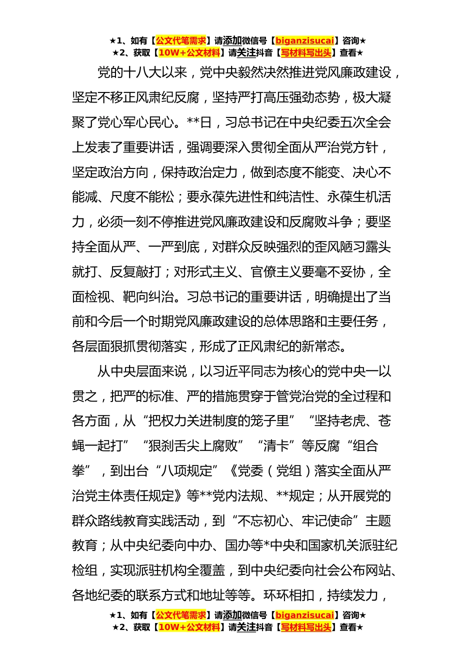 ★1、如有【公文代笔需求】请添加微信号【biganzisucai】咨询★★2、获取【10W+公文材料】请关注抖音【写材料写出头】查看★廉政教育:全力纯正涵养风清气正的良好政治生态一、深化认识,主动适应正风肃纪的新常态我们党从诞生之日起,就把反对消极腐败、建设廉洁政治作为自己的重要奋斗目标,高度重视党内监督和党的纪律工作。**年,在列宁同志的提议下,俄共着手建设党内监察制度,纪检监察制度规定了党内监督制度的架构与运行机制,为中国共产党提供了解决同样问题的理论依据,并引导我国开始了构建党的纪检监察体制的探索。**中共一大召开,中国共产党成立,在创立之初就树立了纪律检查思想,并逐步明确了纪律检查在我党建设中的重要地位,开始对纪律检查的内容进行逐步完善。**年,中共五大召开,会议闭幕时...