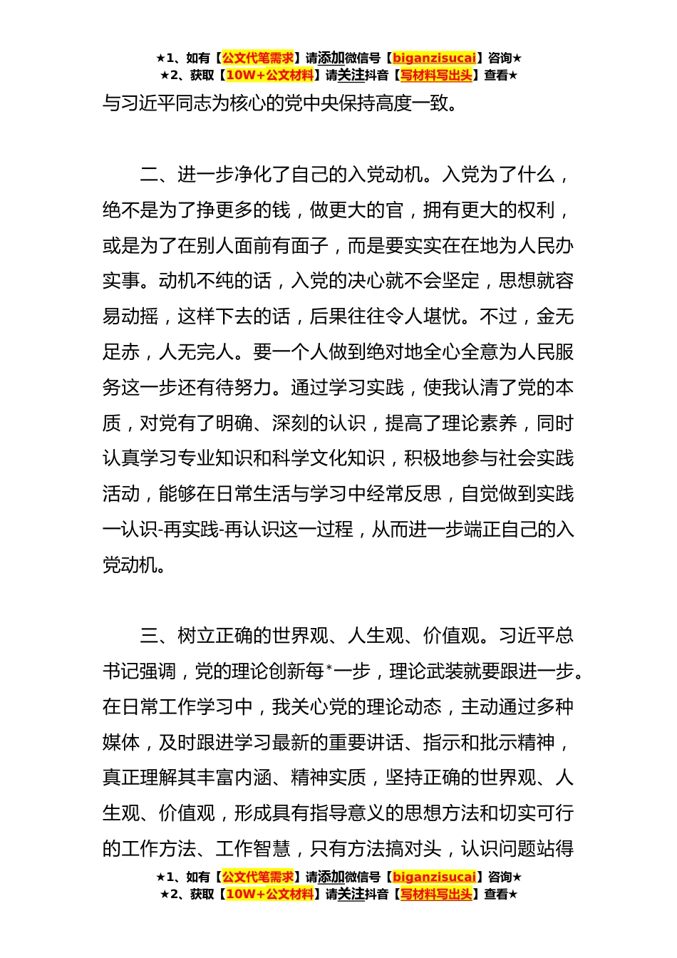 ★1、如有【公文代笔需求】请添加微信号【biganzisucai】咨询★★2、获取【10W+公文材料】请关注抖音【写材料写出头】查看★关于二季度入党积极分子思想汇报尊敬的党组织:很荣幸能成为党组织确定的一名入党积极分子,心情无比地激动,也更加地明确了自己所肩负的责任和使命。通过二季度这三个月时间的学习,让我对党有了进一步的了解和认识,使我更加坚信在党组织的培养下,能够更好地树立正确的世界观、人生观、价值观。现将第二季度的思想情况汇报如下:一、进一步加强了对党的了解和认识。通过学习党史党章,党的二十大精神以及习近平总书记在学习贯彻习近平新时代中国特色社会主义思想主题教育工作会议上的讲话,使我对党的性质、纲领、任务和宗旨都有了进一步的认识,使我更深刻得了解到中国共产党的崇高追...