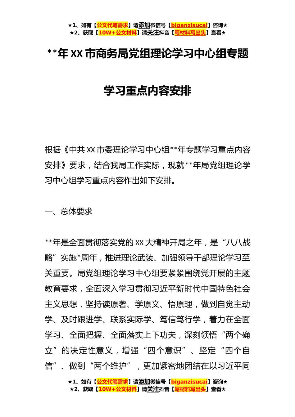 ★1、如有【公文代笔需求】请添加微信号【biganzisucai】咨询★★2、获取【10W+公文材料】请关注抖音【写材料写出头】查看★**年XX市商务局党组理论学习中心组专题学习重点内容安排根据《中共XX市委理论学习中心组**年专题学习重点内容安排》要求,结合我局工作实际,现就**年局党组理论学习中心组学习重点内容作出如下安排。一、总体要求**年是全面贯彻落实党的XX大精神开局之年,是“八八战略”实施*周年,推进理论武装、加强领导干部理论学习至关重要。局党组理论学习中心组要紧紧围绕党开展的主题教育要求,全面深入学习贯彻习近平新时代中国特色社会主义思想,坚持读原著、学原文、悟原理,做到自觉主动学、及时跟进学、联系实际学、笃信笃行学,着力在全面学习、全面把握、全面落实上下功夫,深刻领悟“两个...