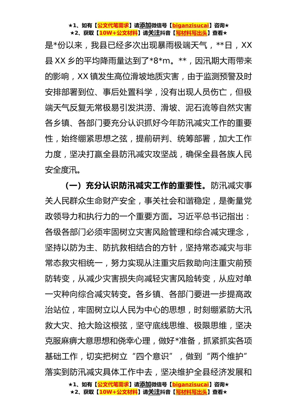 ★1、如有【公文代笔需求】请添加微信号【biganzisucai】咨询★★2、获取【10W+公文材料】请关注抖音【写材料写出头】查看★在全县防汛减灾工作会议上的讲话今天下午,我们参加了*防汛减灾工作会议,这是州委、州政府召开的一次十分重要的会议,主要是进一步增强防汛减灾工作的思想自觉、政治自觉和行动自觉,切实抓好防汛减灾各项工作,全力确保人民群众生命财产安全。由于我县气候反复无常、地质条件复杂,因此,在*防汛减灾工作会议召开之后,我们紧接着召开全县防汛减灾工作会议,主要目的是认真学习习近平总书记关于防灾减灾救灾工作的重要指示批示精神,全面贯彻落实*防汛减灾工作会议要求,进一步分析全县防汛减灾工作形势,深刻汲取去年暴雨泥石流灾害教训,对全县防汛减灾工作进行再安排再部署、再落实。...