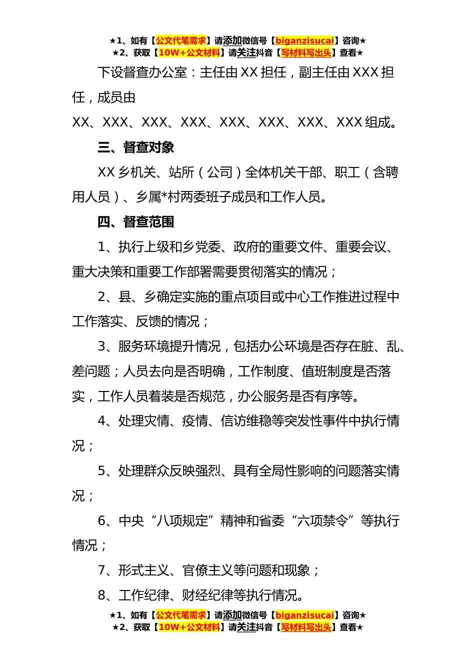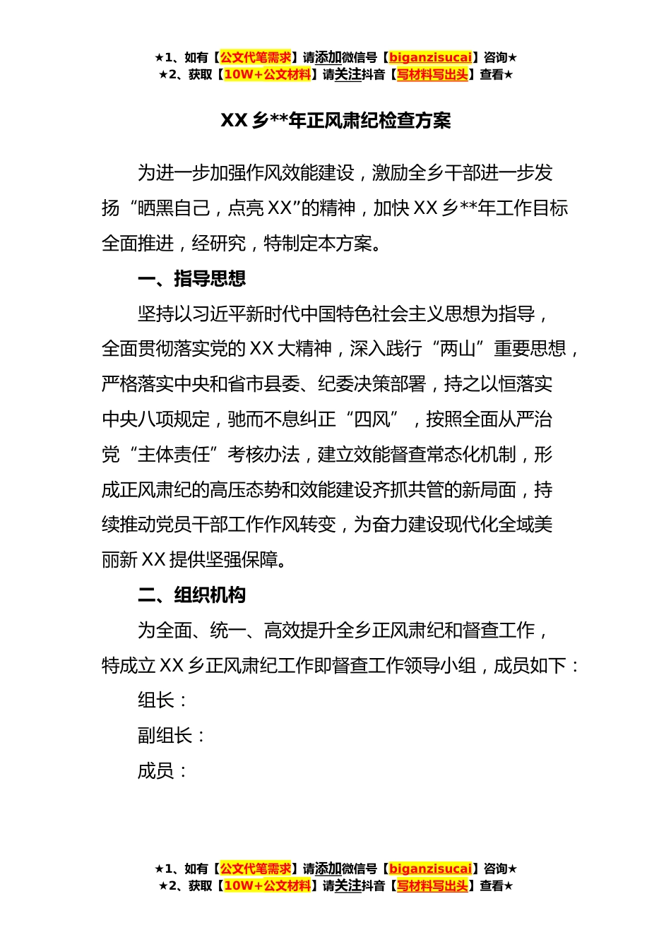 ★1、如有【公文代笔需求】请添加微信号【biganzisucai】咨询★★2、获取【10W+公文材料】请关注抖音【写材料写出头】查看★XX乡**年正风肃纪检查方案为进一步加强作风效能建设,激励全乡干部进一步发扬“晒黑自己,点亮XX”的精神,加快XX乡**年工作目标全面推进,经研究,特制定本方案。一、指导思想坚持以习近平新时代中国特色社会主义思想为指导,全面贯彻落实党的XX大精神,深入践行“两山”重要思想,严格落实中央和省市县委、纪委决策部署,持之以恒落实中央八项规定,驰而不息纠正“四风”,按照全面从严治党“主体责任”考核办法,建立效能督查常态化机制,形成正风肃纪的高压态势和效能建设齐抓共管的新局面,持续推动党员干部工作作风转变,为奋力建设现代化全域美丽新XX提供坚强保障。二、组织机构为...