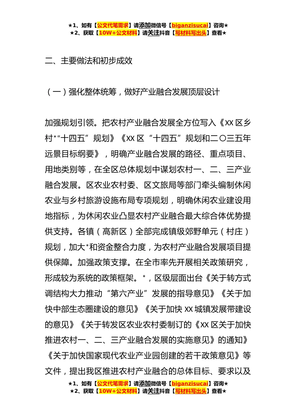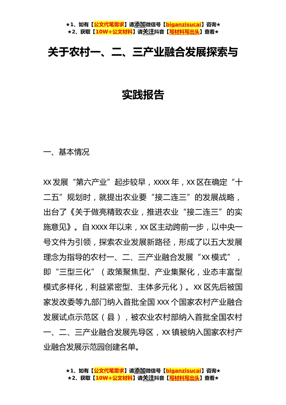 ★1、如有【公文代笔需求】请添加微信号【biganzisucai】咨询★★2、获取【10W+公文材料】请关注抖音【写材料写出头】查看★关于农村一、二、三产业融合发展探索与实践报告一、基本情况XX发展“第六产业”起步较早,XXXX年,XX区在确定“十二五”规划时,就提出农业要“接二连三”的发展战略,出台了《关于做亮精致农业,推进农业“接二连三”的实施意见》。自XXXX年以来,XX区主动跨前一步,以中央一号文件为引领,探索农业发展新路径,形成了以五大发展理念为指导的农村一、二、三产业融合发展“XX模式”,即“三型三化”(政策聚焦型、产业集聚化,业态丰富型模式多样化,利益紧密型、主体多元化)。XX区先后被国家发改委等九部门纳入首批全国XXX个国家农村产业融合发展试点示范区(县),被农业农村部纳入首批...