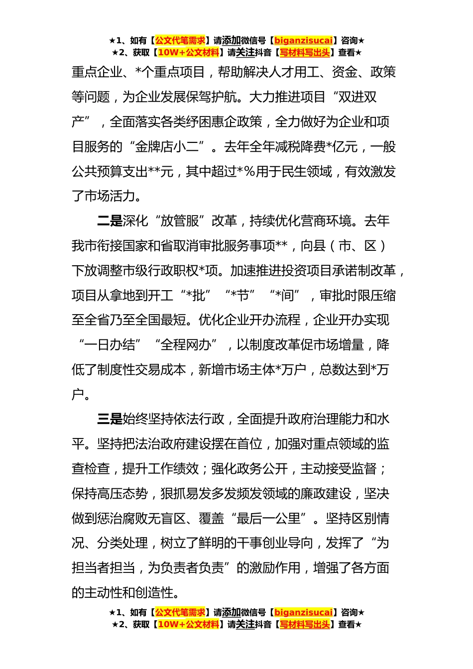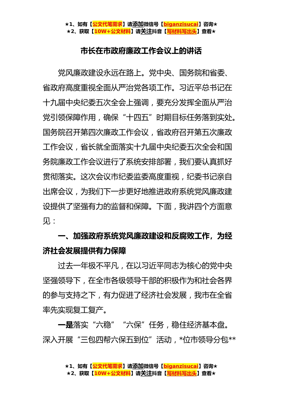 ★1、如有【公文代笔需求】请添加微信号【biganzisucai】咨询★★2、获取【10W+公文材料】请关注抖音【写材料写出头】查看★市长在市政府廉政工作会议上的讲话党风廉政建设永远在路上。党中央、国务院和省委、省政府高度重视全面从严治党各项工作。习近平总书记在十九届中央纪委五次全会上强调,要充分发挥全面从严治党引领保障作用,确保“十四五”时期目标任务落到实处。国务院召开第四次廉政工作会议,省政府召开第五次廉政工作会议,省长就全面落实十九届中央纪委五次全会和国务院廉政工作会议进行了系统安排部署,我们要认真抓好贯彻落实。这次会议市纪委监委高度重视,纪委书记亲自出席会议,为我们下一步更好地推进政府系统党风廉政建设提供了坚强有力的监督和保障。下面,我讲四个方面意见:一、加强政府...