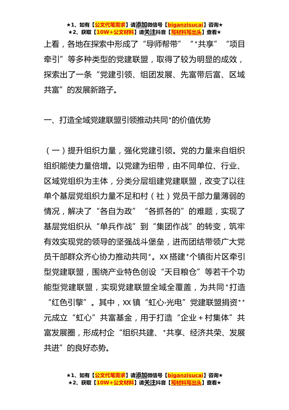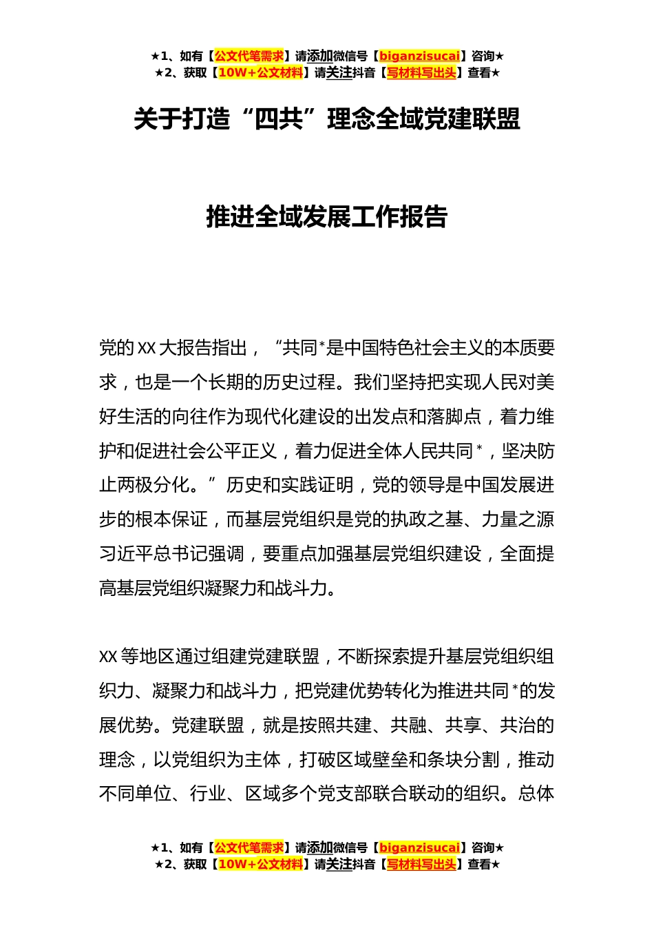 ★1、如有【公文代笔需求】请添加微信号【biganzisucai】咨询★★2、获取【10W+公文材料】请关注抖音【写材料写出头】查看★关于打造“四共”理念全域党建联盟推进全域发展工作报告党的XX大报告指出,“共同*是中国特色社会主义的本质要求,也是一个长期的历史过程。我们坚持把实现人民对美好生活的向往作为现代化建设的出发点和落脚点,着力维护和促进社会公平正义,着力促进全体人民共同*,坚决防止两极分化。”历史和实践证明,党的领导是中国发展进步的根本保证,而基层党组织是党的执政之基、力量之源习近平总书记强调,要重点加强基层党组织建设,全面提高基层党组织凝聚力和战斗力。XX等地区通过组建党建联盟,不断探索提升基层党组织组织力、凝聚力和战斗力,把党建优势转化为推进共同*的发展优势。党建联...