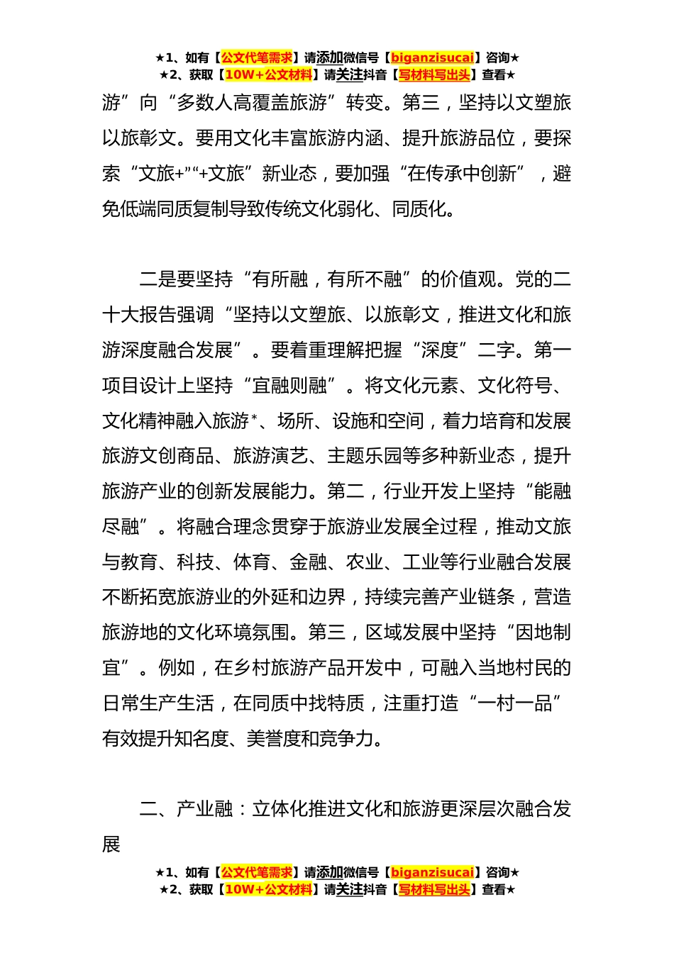 ★1、如有【公文代笔需求】请添加微信号【biganzisucai】咨询★★2、获取【10W+公文材料】请关注抖音【写材料写出头】查看★推进文化和旅游深度融合发展经验材料党的二十大报告提出,坚持以文塑旅、以旅彰文,推进文化和旅游深度融合发展。****省要以党的二十大精神为指引,将文旅融合置身于中国式现代化的整体布局,从观念融、产业融、要素融三个维度,在更广范围、更深层次、更高水平上推进文旅融合发展。一、观念融:高站位推进文化和旅游更广范围融合发展一是要满足人民对美好生活的新需要。文旅融合是文旅发展的时代主题,就是要更好满足人民日益增长的美好生活需要。第一,坚持高质量发展。要在交通便利、设施充足、服务周到、文化融入方面下功夫,努力提升游客满意度和幸福感,在加快推进文旅融合发展和建...
