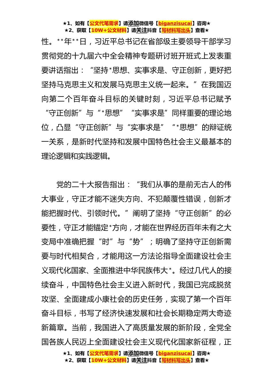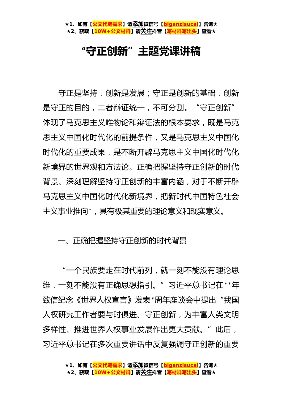 ★1、如有【公文代笔需求】请添加微信号【biganzisucai】咨询★★2、获取【10W+公文材料】请关注抖音【写材料写出头】查看★“守正创新”主题党课讲稿守正是坚持,创新是发展;守正是创新的基础,创新是守正的目的,二者辩证统一,不可分割。“守正创新”体现了马克思主义唯物论和辩证法的根本要求,既是马克思主义中国化时代化的前提条件,又是马克思主义中国化时代化的重要成果,是不断开辟马克思主义中国化时代化新境界的世界观和方法论。正确把握坚持守正创新的时代背景、深刻理解坚持守正创新的丰富内涵,对于不断开辟马克思主义中国化时代化新境界,把新时代中国特色社会主义事业推向*,具有极其重要的理论意义和现实意义。一、正确把握坚持守正创新的时代背景“一个民族要走在时代前列,就一刻不能没有理论...