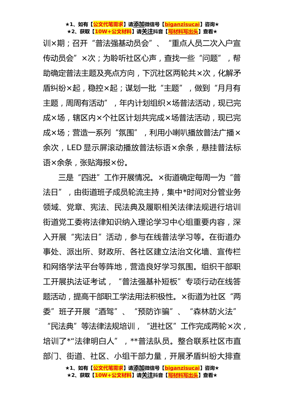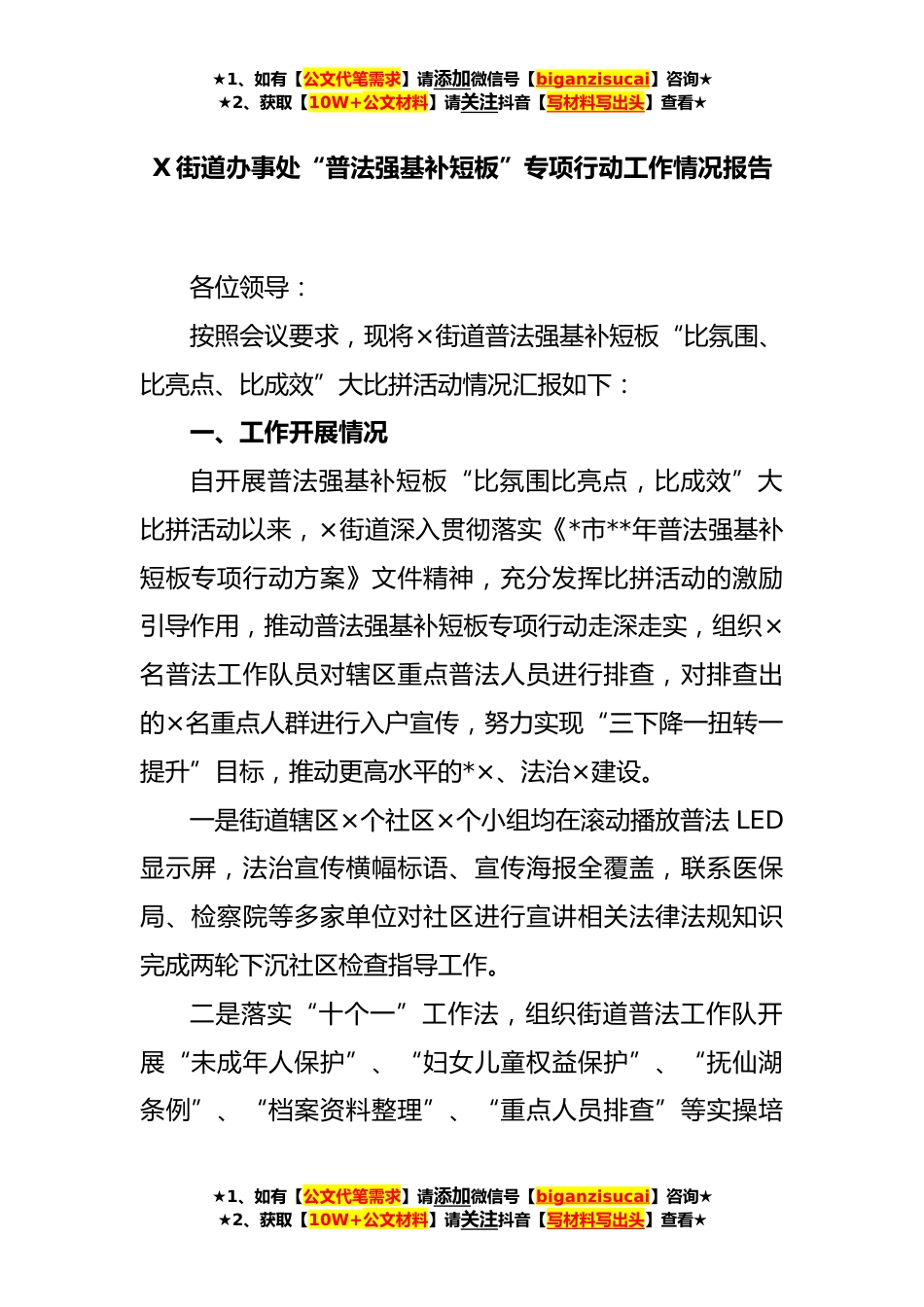★1、如有【公文代笔需求】请添加微信号【biganzisucai】咨询★★2、获取【10W+公文材料】请关注抖音【写材料写出头】查看★X街道办事处“普法强基补短板”专项行动工作情况报告各位领导:按照会议要求,现将×街道普法强基补短板“比氛围、比亮点、比成效”大比拼活动情况汇报如下:一、工作开展情况自开展普法强基补短板“比氛围比亮点,比成效”大比拼活动以来,×街道深入贯彻落实《*市**年普法强基补短板专项行动方案》文件精神,充分发挥比拼活动的激励引导作用,推动普法强基补短板专项行动走深走实,组织×名普法工作队员对辖区重点普法人员进行排查,对排查出的×名重点人群进行入户宣传,努力实现“三下降一扭转一提升”目标,推动更高水平的*×、法治×建设。一是街道辖区×个社区×个小组均在滚动播放...