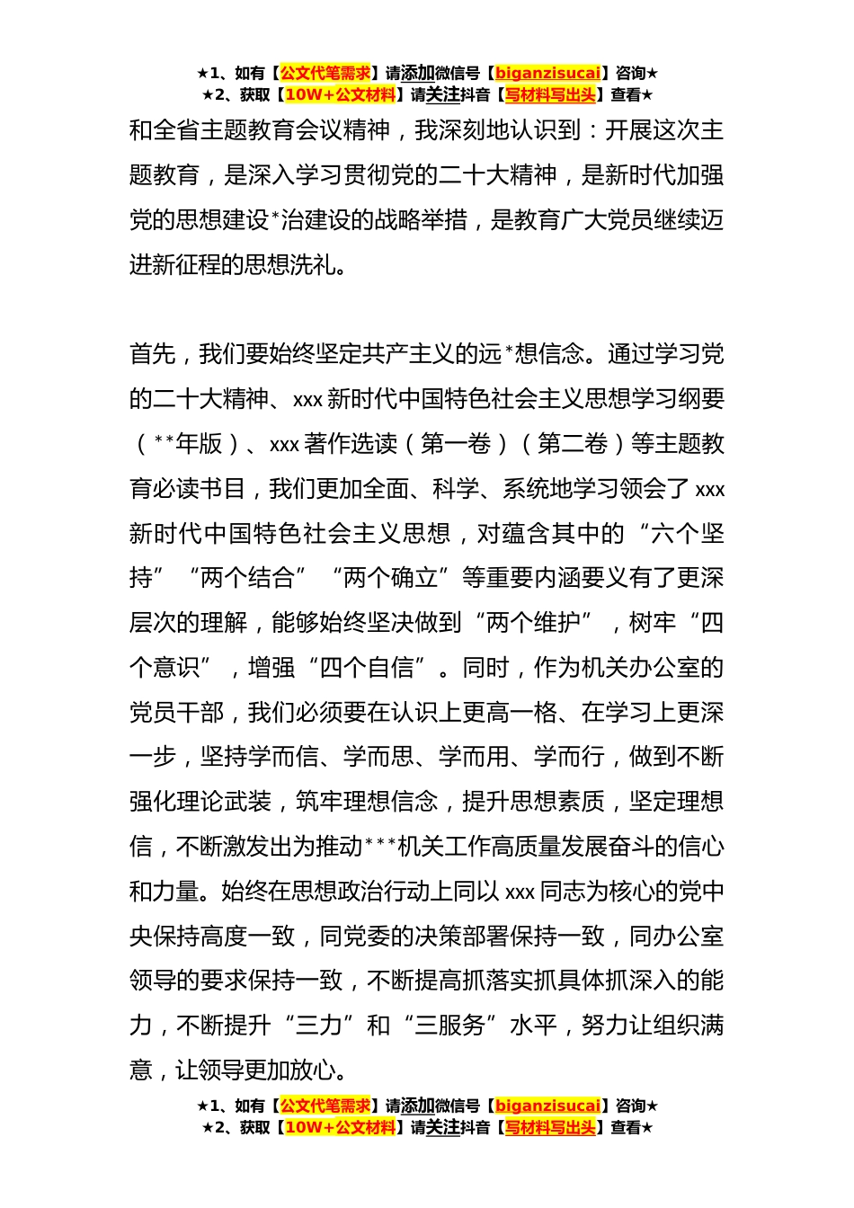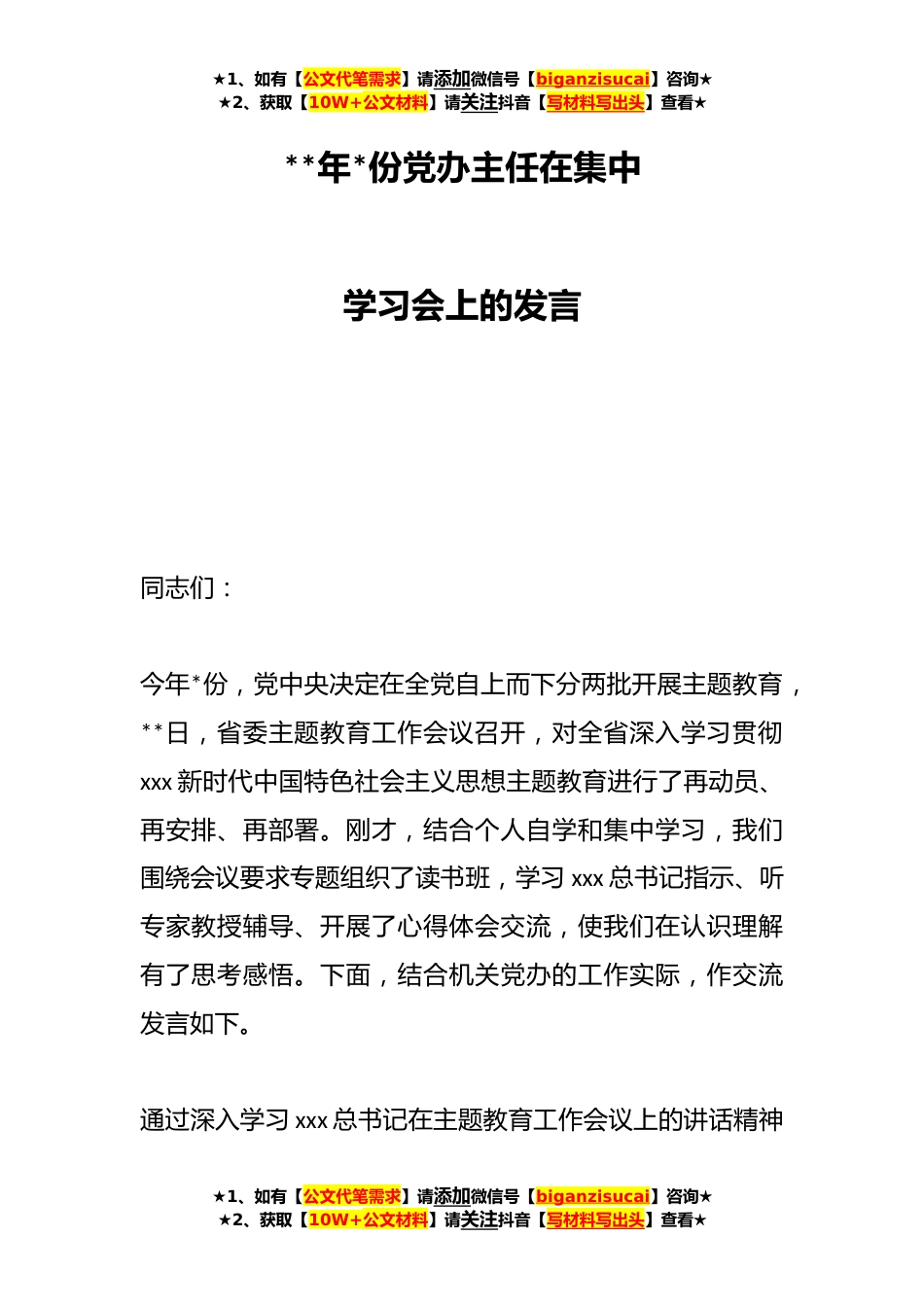 ★1、如有【公文代笔需求】请添加微信号【biganzisucai】咨询★★2、获取【10W+公文材料】请关注抖音【写材料写出头】查看★**年*份党办主任在集中学习会上的发言同志们:今年*份,党中央决定在全党自上而下分两批开展主题教育,**日,省委主题教育工作会议召开,对全省深入学习贯彻xxx新时代中国特色社会主义思想主题教育进行了再动员、再安排、再部署。刚才,结合个人自学和集中学习,我们围绕会议要求专题组织了读书班,学习xxx总书记指示、听专家教授辅导、开展了心得体会交流,使我们在认识理解有了思考感悟。下面,结合机关党办的工作实际,作交流发言如下。通过深入学习xxx总书记在主题教育工作会议上的讲话精神★1、如有【公文代笔需求】请添加微信号【biganzisucai】咨询★★2、获取【10W+公文材料】请关...