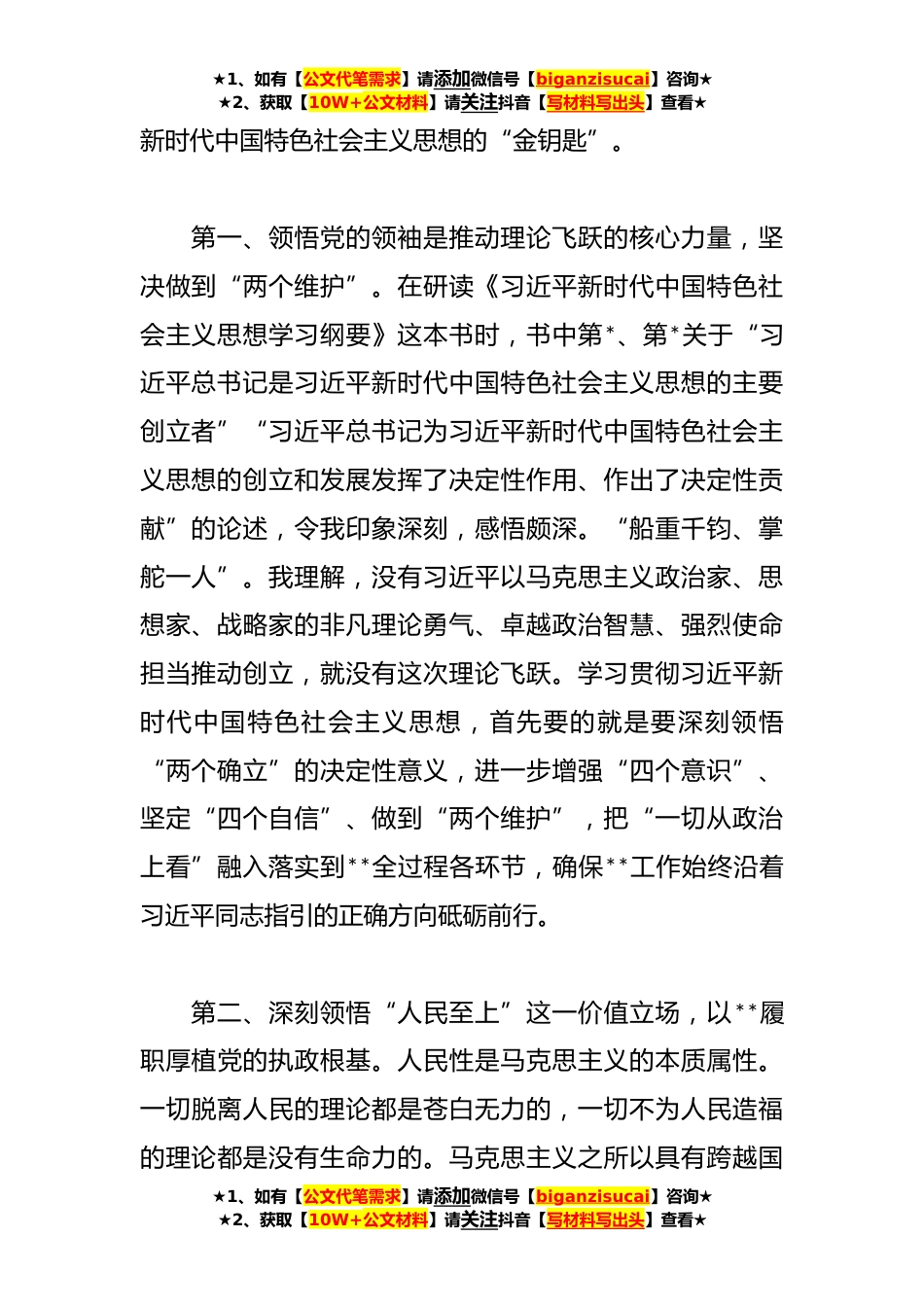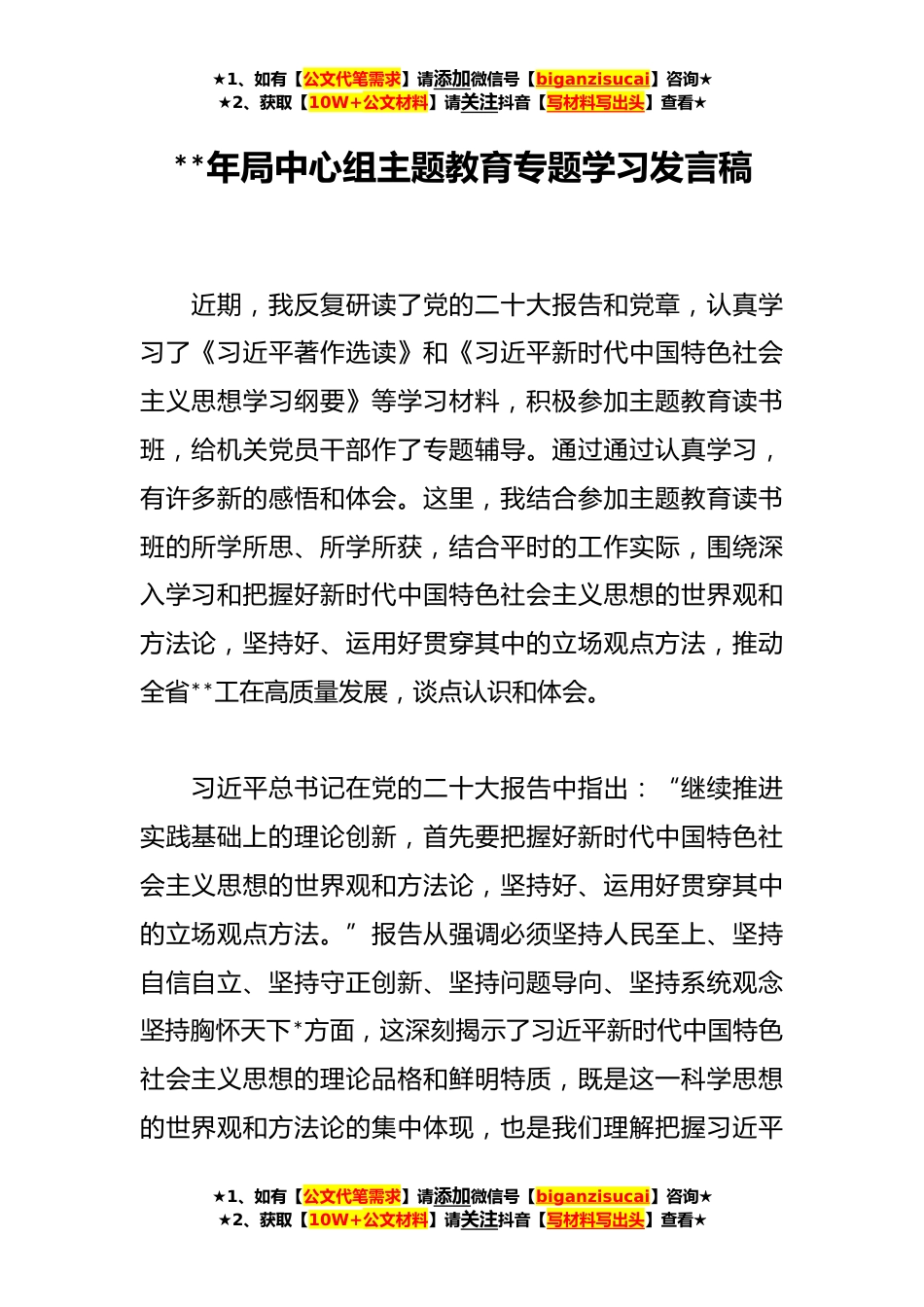 ★1、如有【公文代笔需求】请添加微信号【biganzisucai】咨询★★2、获取【10W+公文材料】请关注抖音【写材料写出头】查看★**年局中心组主题教育专题学习发言稿近期,我反复研读了党的二十大报告和党章,认真学习了《习近平著作选读》和《习近平新时代中国特色社会主义思想学习纲要》等学习材料,积极参加主题教育读书班,给机关党员干部作了专题辅导。通过通过认真学习,有许多新的感悟和体会。这里,我结合参加主题教育读书班的所学所思、所学所获,结合平时的工作实际,围绕深入学习和把握好新时代中国特色社会主义思想的世界观和方法论,坚持好、运用好贯穿其中的立场观点方法,推动全省**工在高质量发展,谈点认识和体会。习近平总书记在党的二十大报告中指出:“继续推进实践基础上的理论创新,首先要把握...
