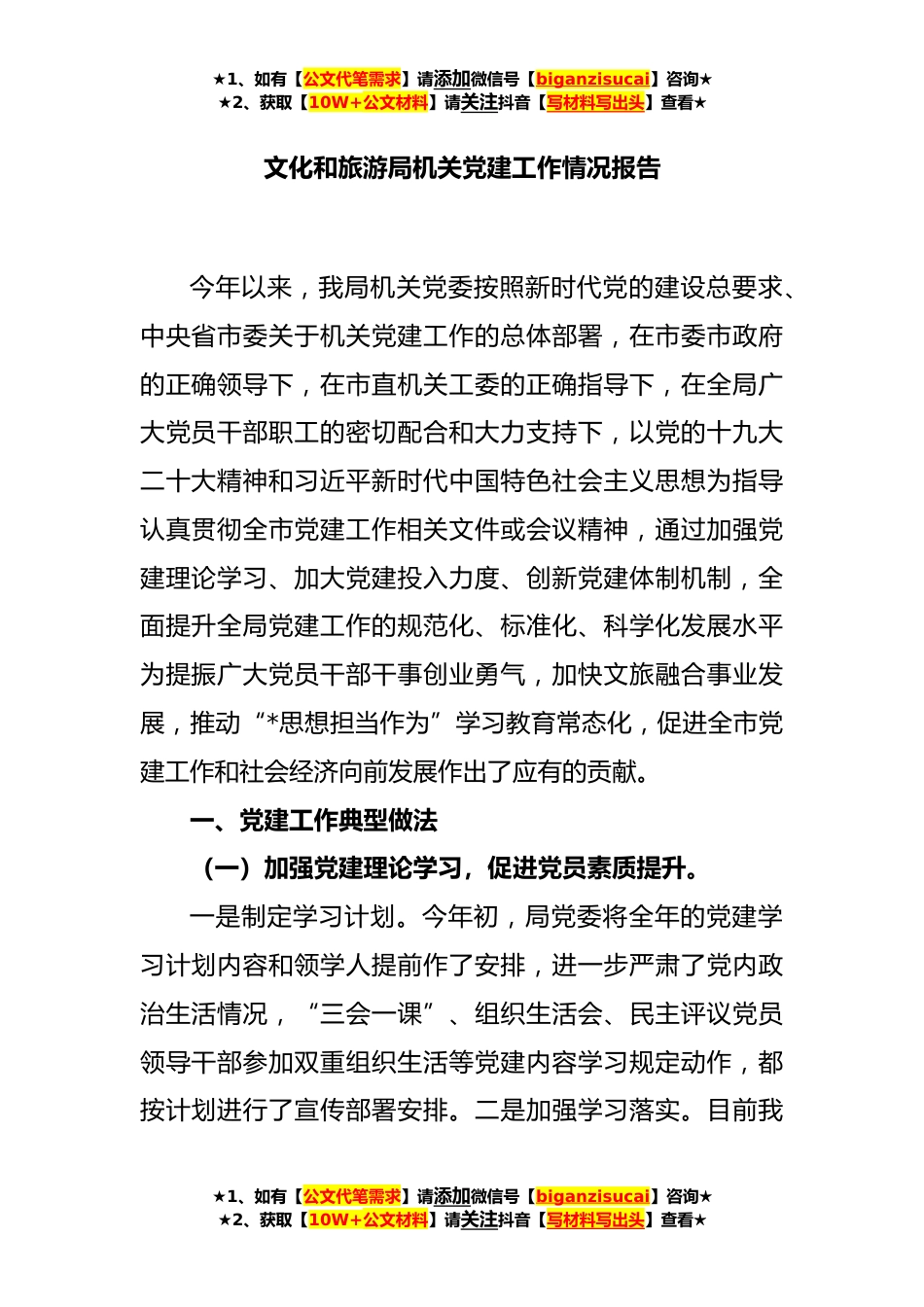 ★1、如有【公文代笔需求】请添加微信号【biganzisucai】咨询★★2、获取【10W+公文材料】请关注抖音【写材料写出头】查看★文化和旅游局机关党建工作情况报告今年以来,我局机关党委按照新时代党的建设总要求、中央省市委关于机关党建工作的总体部署,在市委市政府的正确领导下,在市直机关工委的正确指导下,在全局广大党员干部职工的密切配合和大力支持下,以党的十九大二十大精神和习近平新时代中国特色社会主义思想为指导认真贯彻全市党建工作相关文件或会议精神,通过加强党建理论学习、加大党建投入力度、创新党建体制机制,全面提升全局党建工作的规范化、标准化、科学化发展水平为提振广大党员干部干事创业勇气,加快文旅融合事业发展,推动“*思想担当作为”学习教育常态化,促进全市党建工作和社会经济...