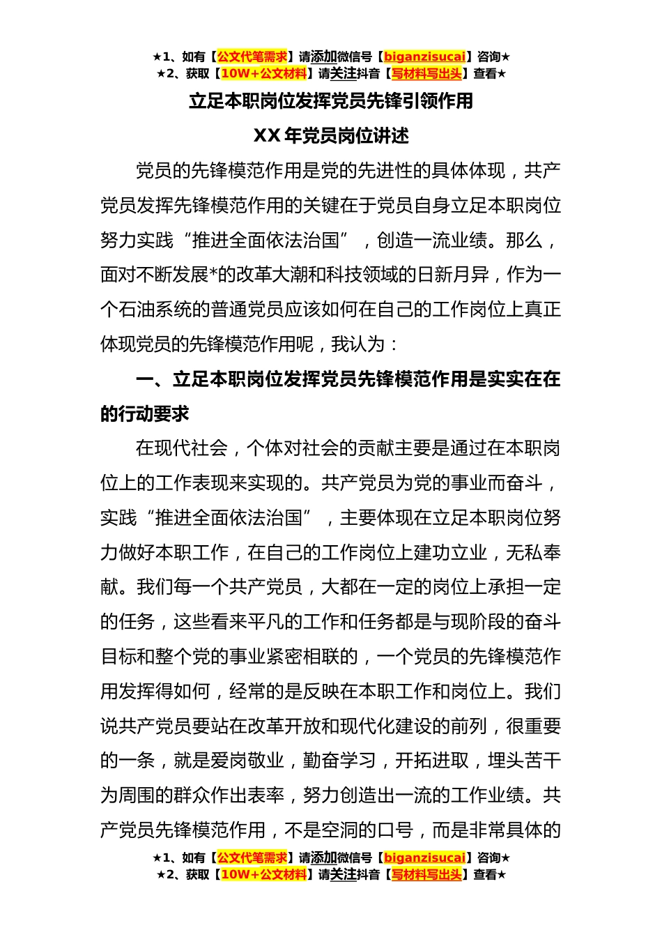★1、如有【公文代笔需求】请添加微信号【biganzisucai】咨询★★2、获取【10W+公文材料】请关注抖音【写材料写出头】查看★立足本职岗位发挥党员先锋引领作用XX年党员岗位讲述党员的先锋模范作用是党的先进性的具体体现,共产党员发挥先锋模范作用的关键在于党员自身立足本职岗位努力实践“推进全面依法治国”,创造一流业绩。那么,面对不断发展*的改革大潮和科技领域的日新月异,作为一个石油系统的普通党员应该如何在自己的工作岗位上真正体现党员的先锋模范作用呢,我认为:一、立足本职岗位发挥党员先锋模范作用是实实在在的行动要求在现代社会,个体对社会的贡献主要是通过在本职岗位上的工作表现来实现的。共产党员为党的事业而奋斗,实践“推进全面依法治国”,主要体现在立足本职岗位努力做好本职工作,...