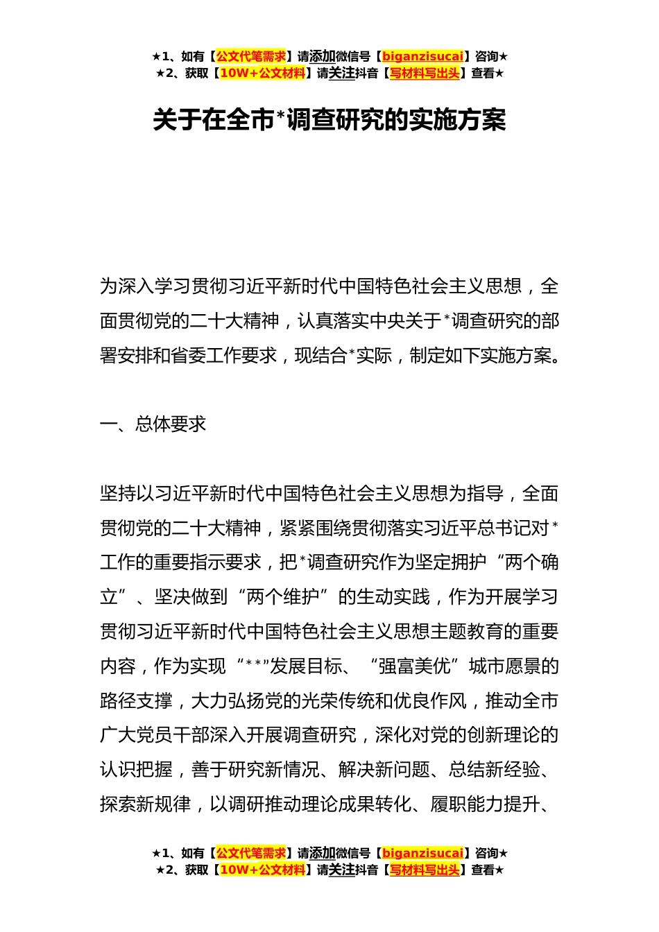 ★1、如有【公文代笔需求】请添加微信号【biganzisucai】咨询★★2、获取【10W+公文材料】请关注抖音【写材料写出头】查看★关于在全市*调查研究的实施方案为深入学习贯彻习近平新时代中国特色社会主义思想,全面贯彻党的二十大精神,认真落实中央关于*调查研究的部署安排和省委工作要求,现结合*实际,制定如下实施方案。一、总体要求坚持以习近平新时代中国特色社会主义思想为指导,全面贯彻党的二十大精神,紧紧围绕贯彻落实习近平总书记对*工作的重要指示要求,把*调查研究作为坚定拥护“两个确立”、坚决做到“两个维护”的生动实践,作为开展学习贯彻习近平新时代中国特色社会主义思想主题教育的重要内容,作为实现“**”发展目标、“强富美优”城市愿景的路径支撑,大力弘扬党的光荣传统和优良作风,推动全...