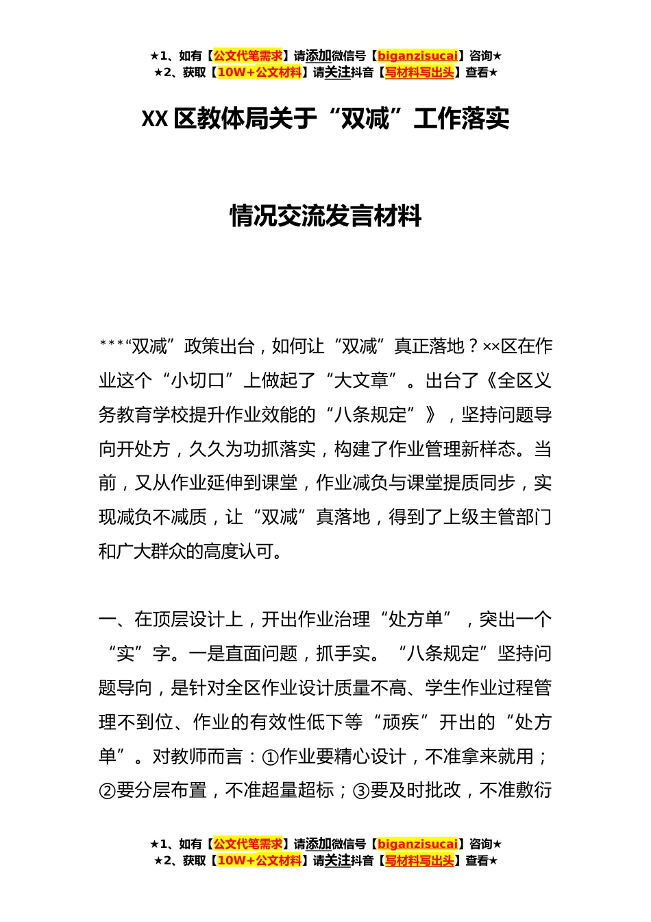 ★1、如有【公文代笔需求】请添加微信号【biganzisucai】咨询★★2、获取【10W+公文材料】请关注抖音【写材料写出头】查看★XX区教体局关于“双减”工作落实情况交流发言材料***“双减”政策出台,如何让“双减”真正落地?××区在作业这个“小切口”上做起了“大文章”。出台了《全区义务教育学校提升作业效能的“八条规定”》,坚持问题导向开处方,久久为功抓落实,构建了作业管理新样态。当前,又从作业延伸到课堂,作业减负与课堂提质同步,实现减负不减质,让“双减”真落地,得到了上级主管部门和广大群众的高度认可。一、在顶层设计上,开出作业治理“处方单”,突出一个“实”字。一是直面问题,抓手实。“八条规定”坚持问题导向,是针对全区作业设计质量不高、学生作业过程管理不到位、作业的有效性低...
