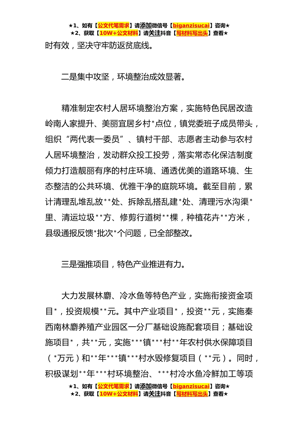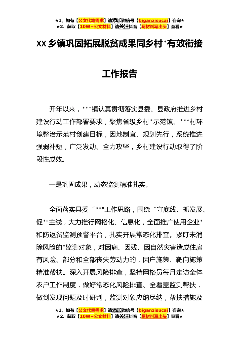 ★1、如有【公文代笔需求】请添加微信号【biganzisucai】咨询★★2、获取【10W+公文材料】请关注抖音【写材料写出头】查看★XX乡镇巩固拓展脱贫成果同乡村*有效衔接工作报告开年以来,***镇认真贯彻落实县委、县政府推进乡村建设行动工作部署要求,聚焦省级乡村*示范镇、***村环境整治示范村创建目标,因地制宜、规划先行,系统推进强弱补短,广泛发动、全力攻坚,乡村建设行动取得了阶段性成效。一是巩固成果,动态监测精准扎实。全面落实县委“**”工作思路,围绕“守底线、抓发展、促*”主线,大力推行网格化、信息化,全面推广使用企业*和防返贫监测预警平台,扎实开展常态化排查。紧盯未消除风险的*监测对象,对因病、因残、因自然灾害造成住房有风险、部分和全部丧失劳动力的,因户施策、靶向施策精准帮扶。...