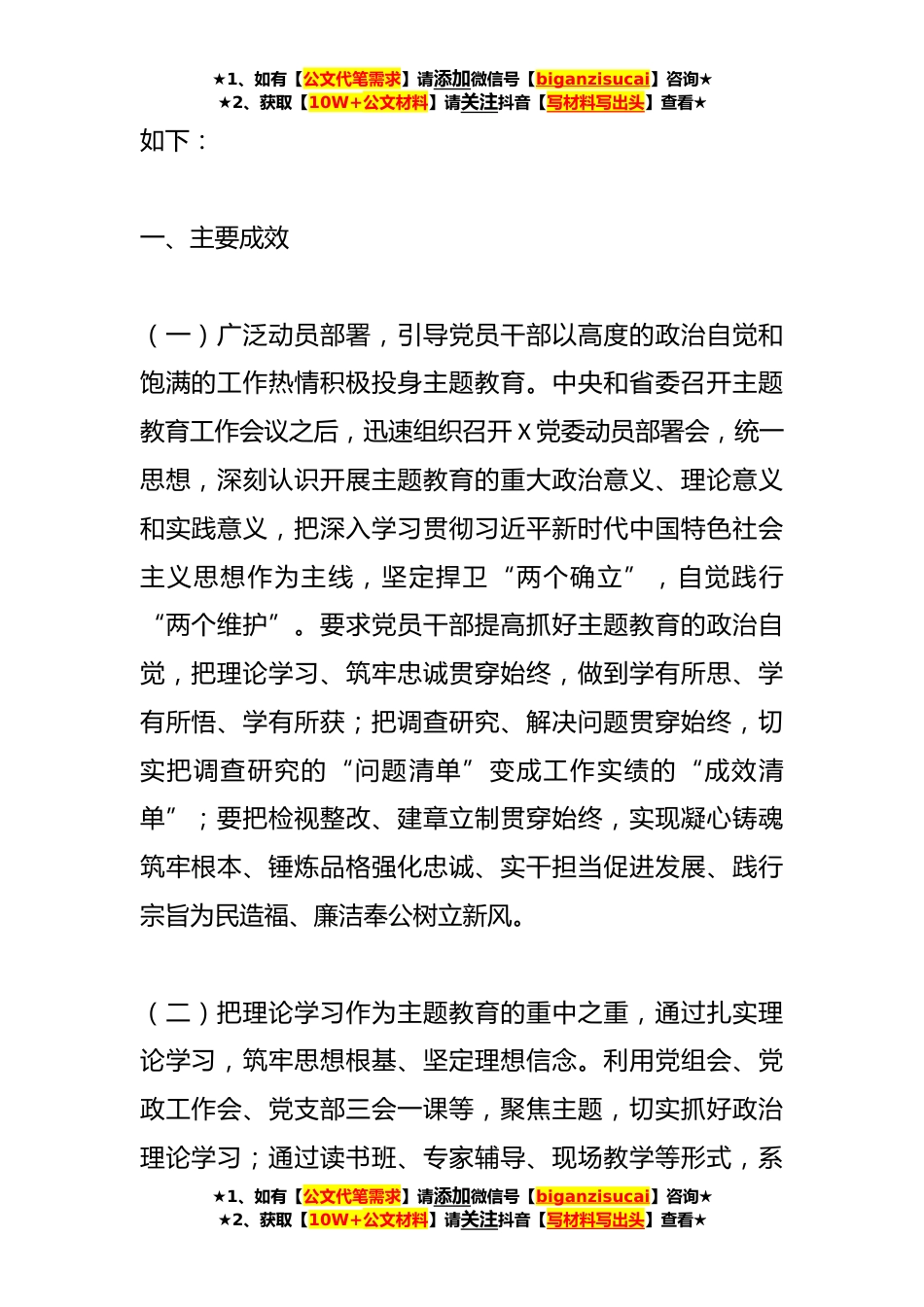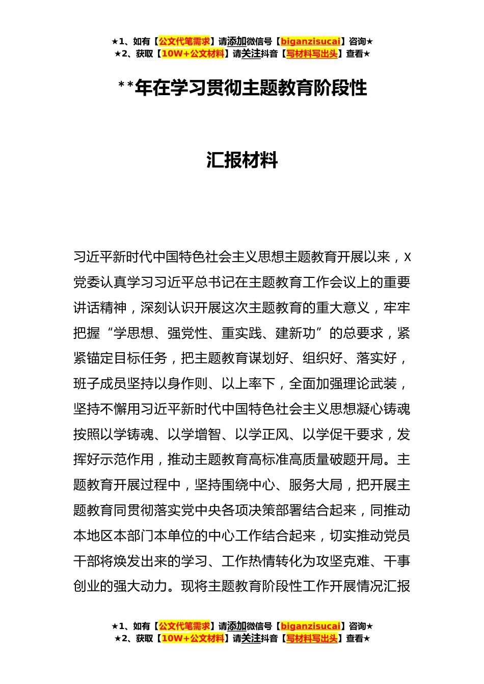 ★1、如有【公文代笔需求】请添加微信号【biganzisucai】咨询★★2、获取【10W+公文材料】请关注抖音【写材料写出头】查看★**年在学习贯彻主题教育阶段性汇报材料习近平新时代中国特色社会主义思想主题教育开展以来,X党委认真学习习近平总书记在主题教育工作会议上的重要讲话精神,深刻认识开展这次主题教育的重大意义,牢牢把握“学思想、强党性、重实践、建新功”的总要求,紧紧锚定目标任务,把主题教育谋划好、组织好、落实好,班子成员坚持以身作则、以上率下,全面加强理论武装,坚持不懈用习近平新时代中国特色社会主义思想凝心铸魂按照以学铸魂、以学增智、以学正风、以学促干要求,发挥好示范作用,推动主题教育高标准高质量破题开局。主题教育开展过程中,坚持围绕中心、服务大局,把开展主题教育同贯...