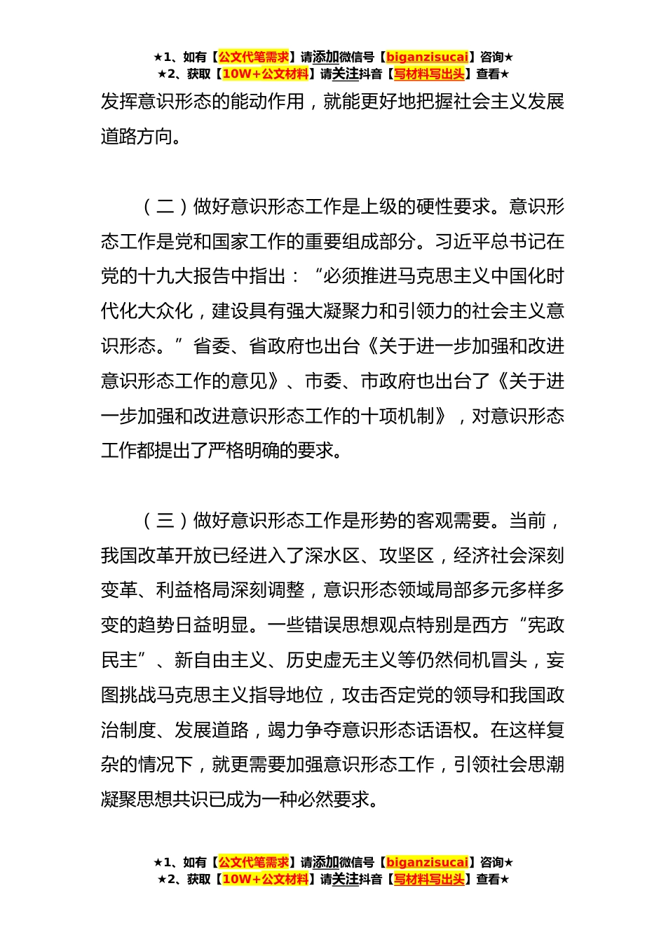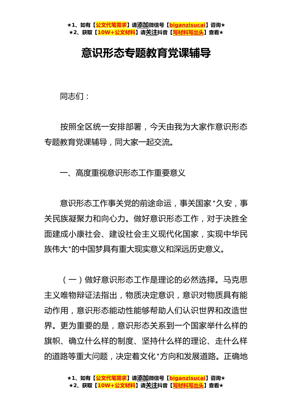 ★1、如有【公文代笔需求】请添加微信号【biganzisucai】咨询★★2、获取【10W+公文材料】请关注抖音【写材料写出头】查看★意识形态专题教育党课辅导同志们:按照全区统一安排部署,今天由我为大家作意识形态专题教育党课辅导,同大家一起交流。一、高度重视意识形态工作重要意义意识形态工作事关党的前途命运,事关国家*久安,事关民族凝聚力和向心力。做好意识形态工作,对于决胜全面建成小康社会、建设社会主义现代化国家,实现中华民族伟大*的中国梦具有重大现实意义和深远历史意义。(一)做好意识形态工作是理论的必然选择。马克思主义唯物辩证法指出,物质决定意识,意识对物质具有能动作用,意识形态能动性能够帮助人们认识世界和改造世界。更为重要的是,意识形态关系到一个国家举什么样的旗帜、确立什...