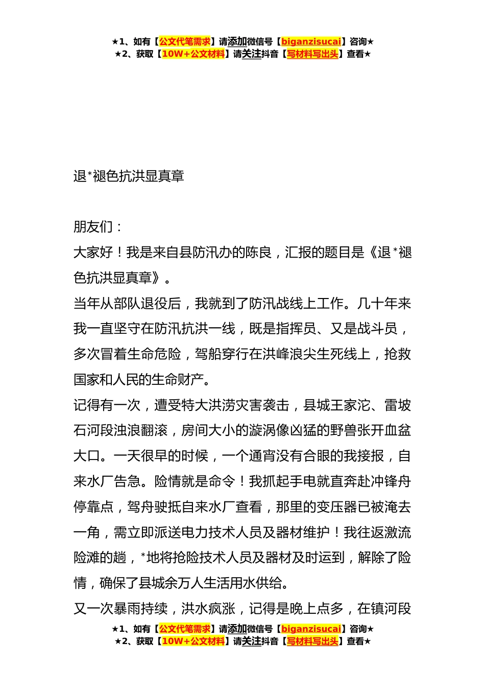 ★1、如有【公文代笔需求】请添加微信号【biganzisucai】咨询★★2、获取【10W+公文材料】请关注抖音【写材料写出头】查看★劳模事迹宣讲材料(*)目录劳模事迹宣讲材料(篇)退*褪色抗洪显真章“退城入园”起好步勇啃“硬骨头”力搏“拦路虎”坚守匠心酿好酒逆行*战毒魔★1、如有【公文代笔需求】请添加微信号【biganzisucai】咨询★★2、获取【10W+公文材料】请关注抖音【写材料写出头】查看★★1、如有【公文代笔需求】请添加微信号【biganzisucai】咨询★★2、获取【10W+公文材料】请关注抖音【写材料写出头】查看★退*褪色抗洪显真章朋友们:大家好!我是来自县防汛办的陈良,汇报的题目是《退*褪色抗洪显真章》。当年从部队退役后,我就到了防汛战线上工作。几十年来我一直坚守在防汛抗洪一线,既是指挥员、...