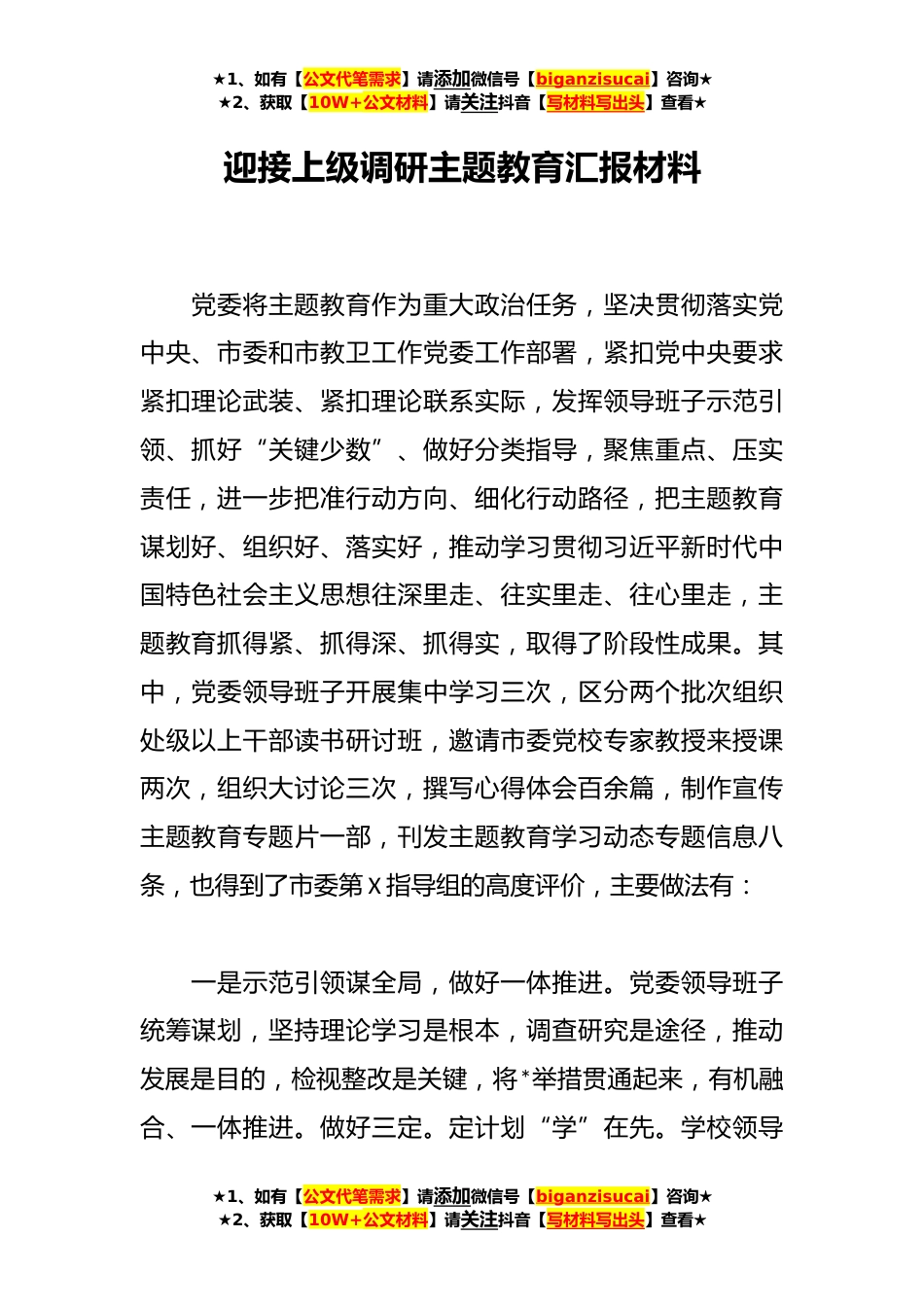 ★1、如有【公文代笔需求】请添加微信号【biganzisucai】咨询★★2、获取【10W+公文材料】请关注抖音【写材料写出头】查看★迎接上级调研主题教育汇报材料党委将主题教育作为重大政治任务,坚决贯彻落实党中央、市委和市教卫工作党委工作部署,紧扣党中央要求紧扣理论武装、紧扣理论联系实际,发挥领导班子示范引领、抓好“关键少数”、做好分类指导,聚焦重点、压实责任,进一步把准行动方向、细化行动路径,把主题教育谋划好、组织好、落实好,推动学习贯彻习近平新时代中国特色社会主义思想往深里走、往实里走、往心里走,主题教育抓得紧、抓得深、抓得实,取得了阶段性成果。其中,党委领导班子开展集中学习三次,区分两个批次组织处级以上干部读书研讨班,邀请市委党校专家教授来授课两次,组织大讨论三次,...