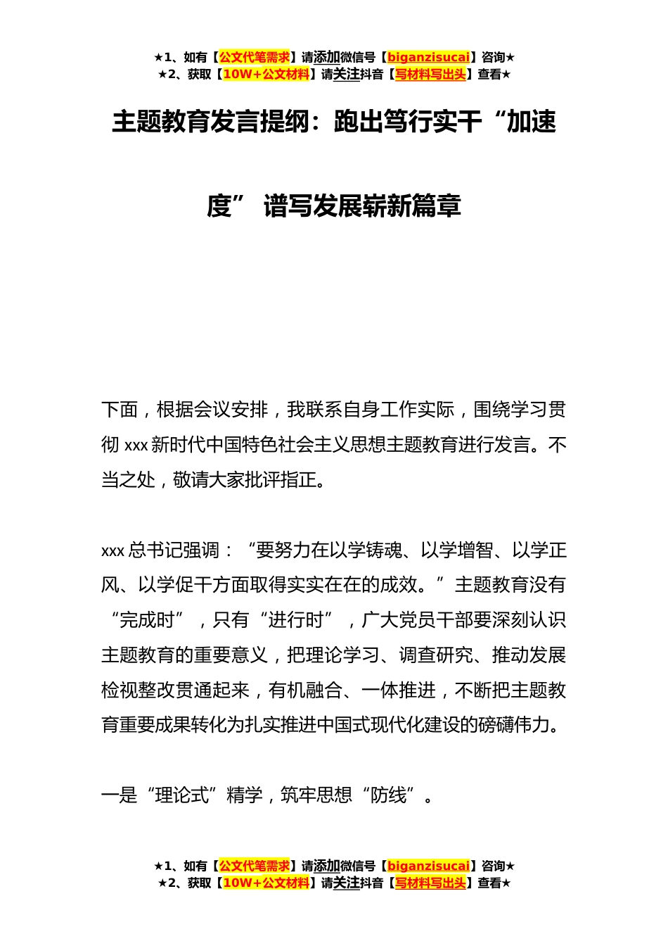 ★1、如有【公文代笔需求】请添加微信号【biganzisucai】咨询★★2、获取【10W+公文材料】请关注抖音【写材料写出头】查看★主题教育发言提纲:跑出笃行实干“加速度”谱写发展崭新篇章下面,根据会议安排,我联系自身工作实际,围绕学习贯彻xxx新时代中国特色社会主义思想主题教育进行发言。不当之处,敬请大家批评指正。xxx总书记强调:“要努力在以学铸魂、以学增智、以学正风、以学促干方面取得实实在在的成效。”主题教育没有“完成时”,只有“进行时”,广大党员干部要深刻认识主题教育的重要意义,把理论学习、调查研究、推动发展检视整改贯通起来,有机融合、一体推进,不断把主题教育重要成果转化为扎实推进中国式现代化建设的磅礴伟力。一是“理论式”精学,筑牢思想“防线”。★1、如有【公文代笔需求...