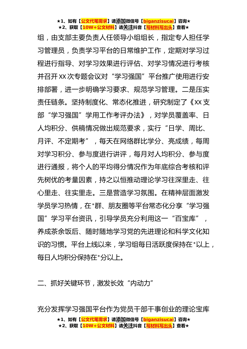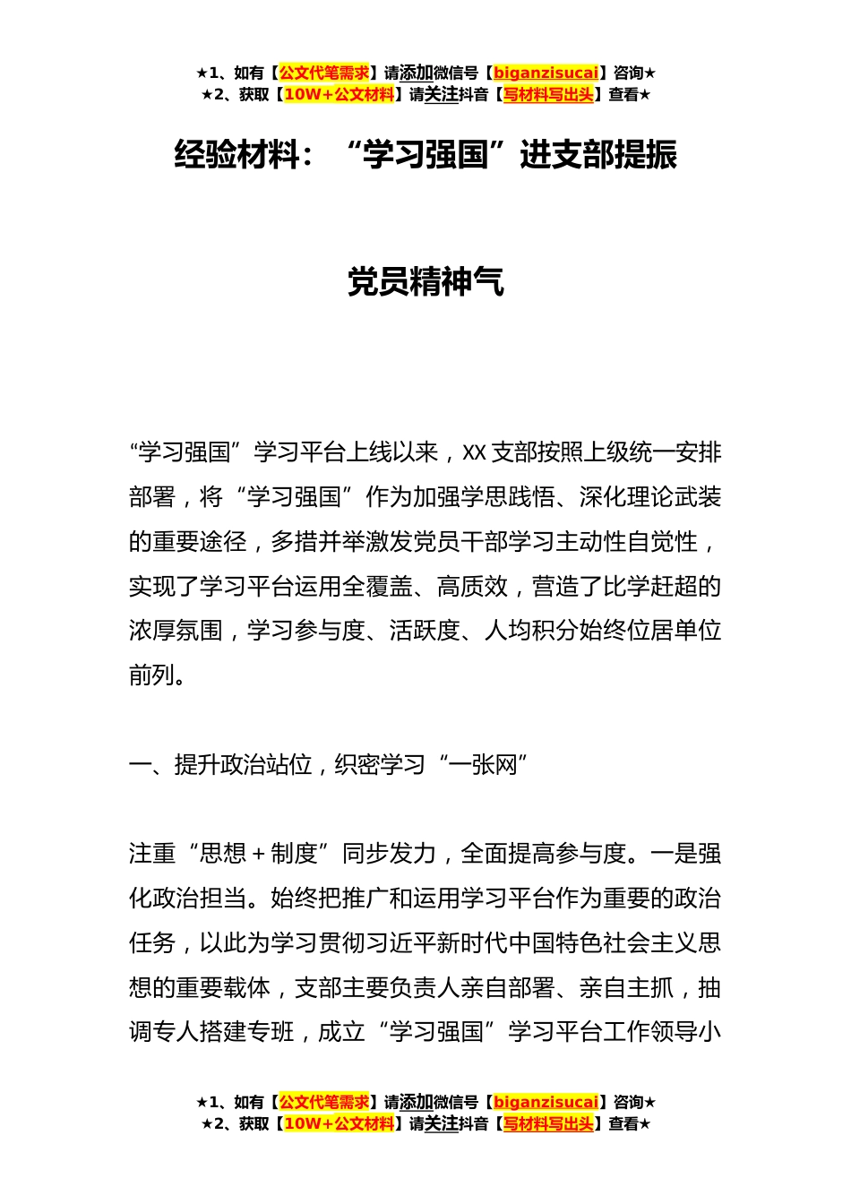 ★1、如有【公文代笔需求】请添加微信号【biganzisucai】咨询★★2、获取【10W+公文材料】请关注抖音【写材料写出头】查看★经验材料:“学习强国”进支部提振党员精神气“学习强国”学习平台上线以来,XX支部按照上级统一安排部署,将“学习强国”作为加强学思践悟、深化理论武装的重要途径,多措并举激发党员干部学习主动性自觉性,实现了学习平台运用全覆盖、高质效,营造了比学赶超的浓厚氛围,学习参与度、活跃度、人均积分始终位居单位前列。一、提升政治站位,织密学习“一张网”注重“思想+制度”同步发力,全面提高参与度。一是强化政治担当。始终把推广和运用学习平台作为重要的政治任务,以此为学习贯彻习近平新时代中国特色社会主义思想的重要载体,支部主要负责人亲自部署、亲自主抓,抽调专人搭建...