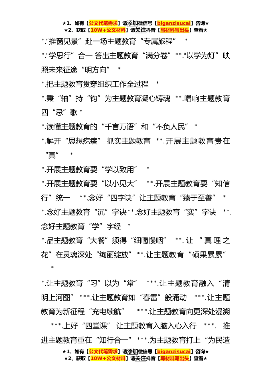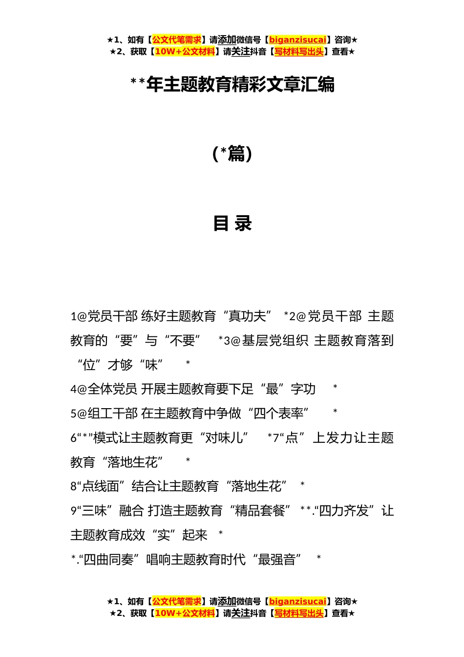★1、如有【公文代笔需求】请添加微信号【biganzisucai】咨询★★2、获取【10W+公文材料】请关注抖音【写材料写出头】查看★**年主题教育精彩文章汇编(*篇)目录1@党员干部练好主题教育“真功夫”*2@党员干部主题教育的“要”与“不要”*3@基层党组织主题教育落到“位”才够“味”*4@全体党员开展主题教育要下足“最”字功*5@组工干部在主题教育中争做“四个表率”*6“*”模式让主题教育更“对味儿”*7“点”上发力让主题教育“落地生花”*8“点线面”结合让主题教育“落地生花”*9“三味”融合打造主题教育“精品套餐”**.“四力齐发”让主题教育成效“实”起来**.“四曲同奏”唱响主题教育时代“最强音”*★1、如有【公文代笔需求】请添加微信号【biganzisucai】咨询★★2、获取【10W+公文材料】请关注抖音【写...