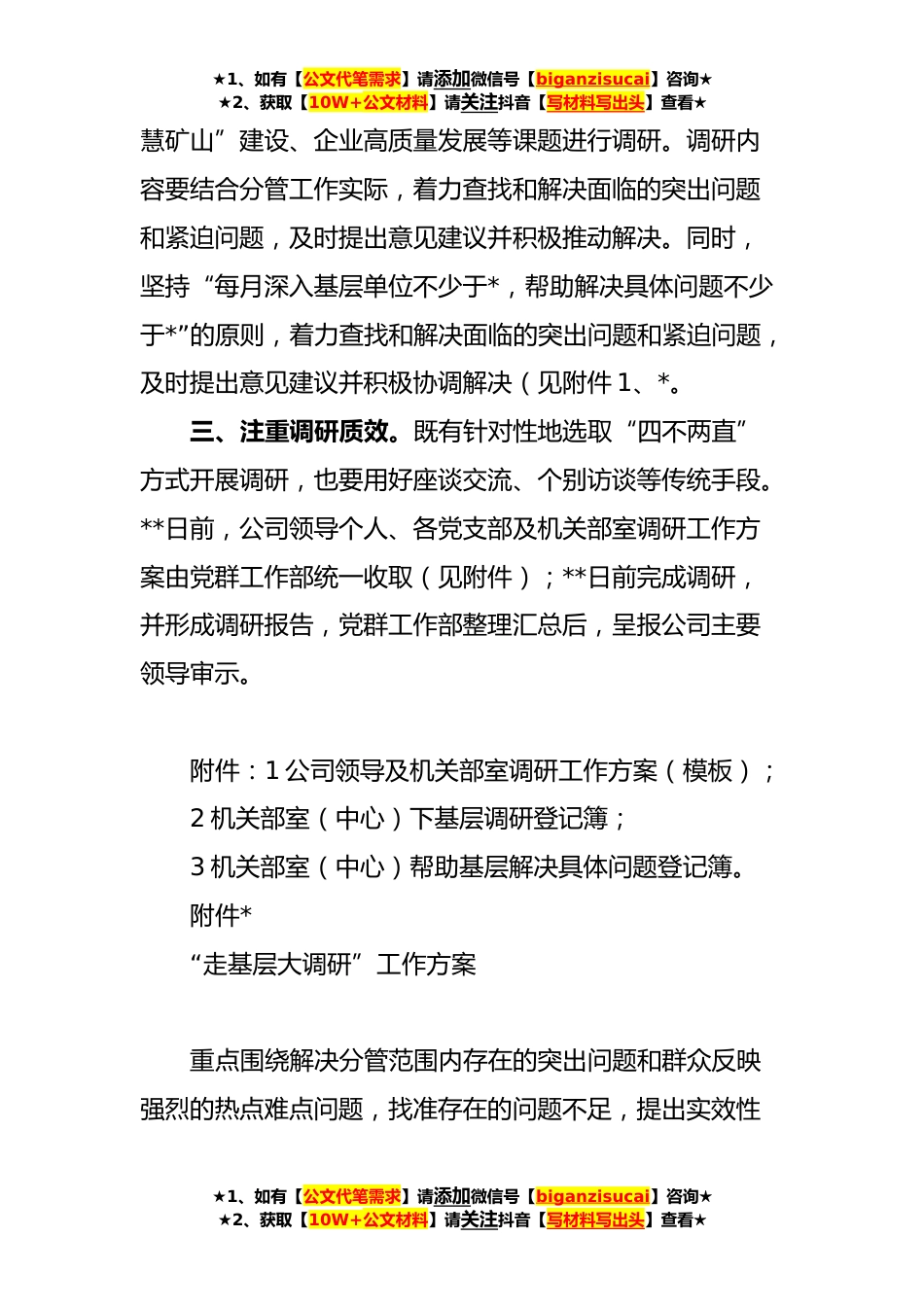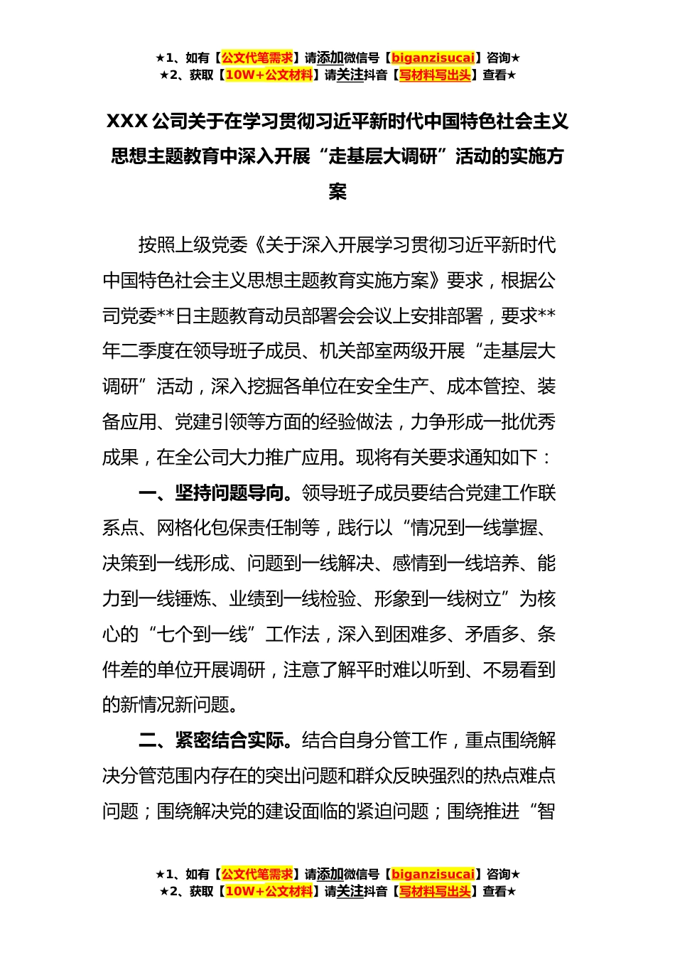 ★1、如有【公文代笔需求】请添加微信号【biganzisucai】咨询★★2、获取【10W+公文材料】请关注抖音【写材料写出头】查看★XXX公司关于在学习贯彻习近平新时代中国特色社会主义思想主题教育中深入开展“走基层大调研”活动的实施方案按照上级党委《关于深入开展学习贯彻习近平新时代中国特色社会主义思想主题教育实施方案》要求,根据公司党委**日主题教育动员部署会会议上安排部署,要求**年二季度在领导班子成员、机关部室两级开展“走基层大调研”活动,深入挖掘各单位在安全生产、成本管控、装备应用、党建引领等方面的经验做法,力争形成一批优秀成果,在全公司大力推广应用。现将有关要求通知如下:一、坚持问题导向。领导班子成员要结合党建工作联系点、网格化包保责任制等,践行以“情况到一线掌握、决策...