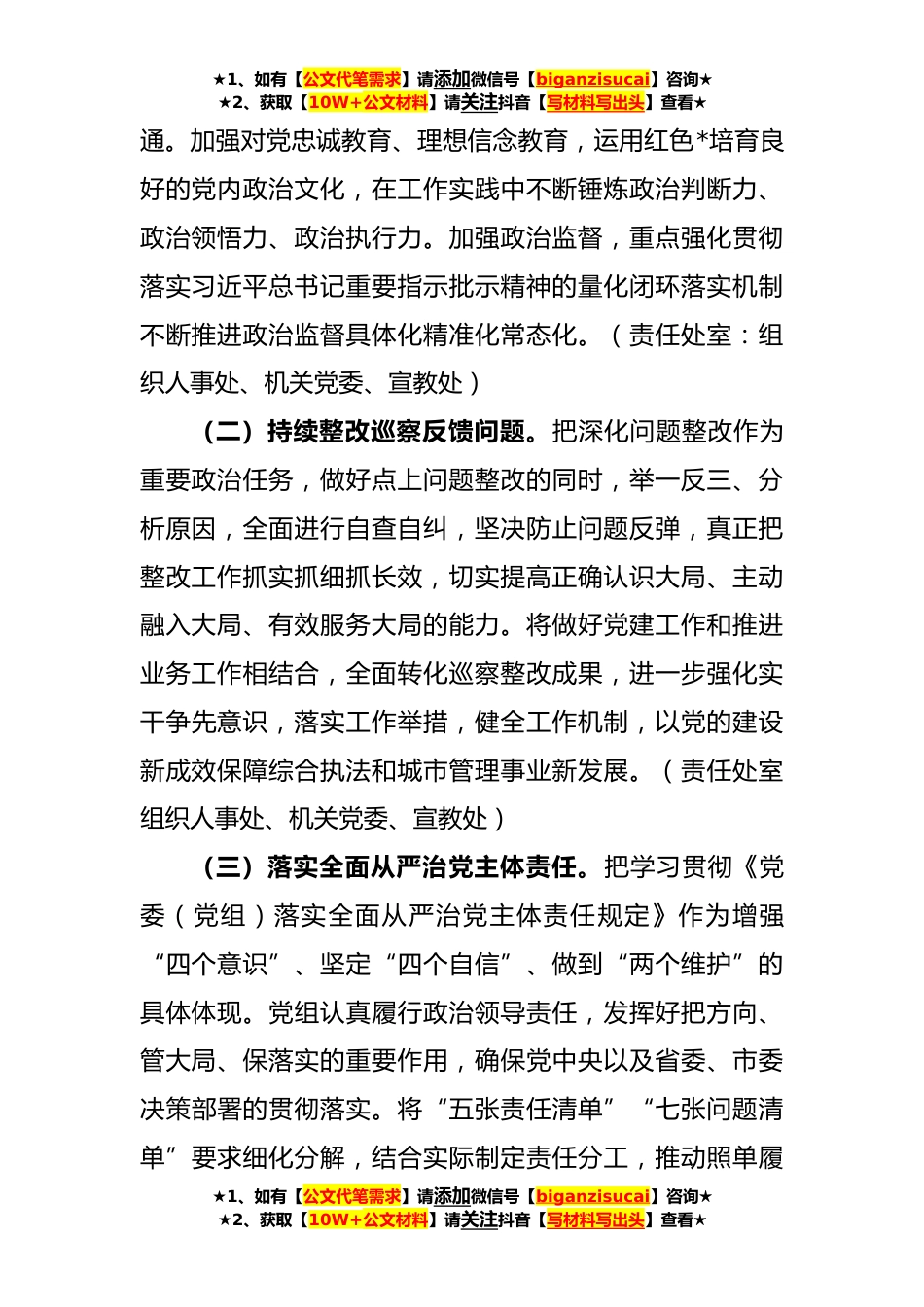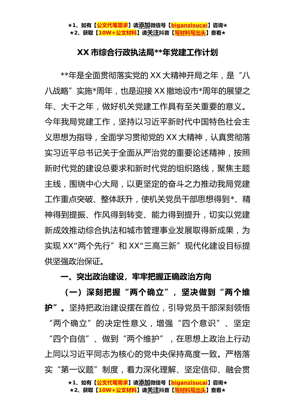 ★1、如有【公文代笔需求】请添加微信号【biganzisucai】咨询★★2、获取【10W+公文材料】请关注抖音【写材料写出头】查看★XX市综合行政执法局**年党建工作计划**年是全面贯彻落实党的XX大精神开局之年,是“八八战略”实施*周年,也是迎接XX撤地设市*周年的展望之年、大干之年,做好机关党建工作具有至关重要的意义。今年我局党建工作,坚持以习近平新时代中国特色社会主义思想为指导,全面学习贯彻党的XX大精神,认真贯彻落实习近平总书记关于全面从严治党的重要论述精神,按照新时代党的建设总要求和新时代党的组织路线,聚焦主题主线,围绕中心大局,以更坚定的奋斗之力推动我局党建工作重点突破、整体跃升,使机关党员干部思想得到*、精神得到提振、作风得到转变、能力得到提升,切实以党建新成效推动综合执...