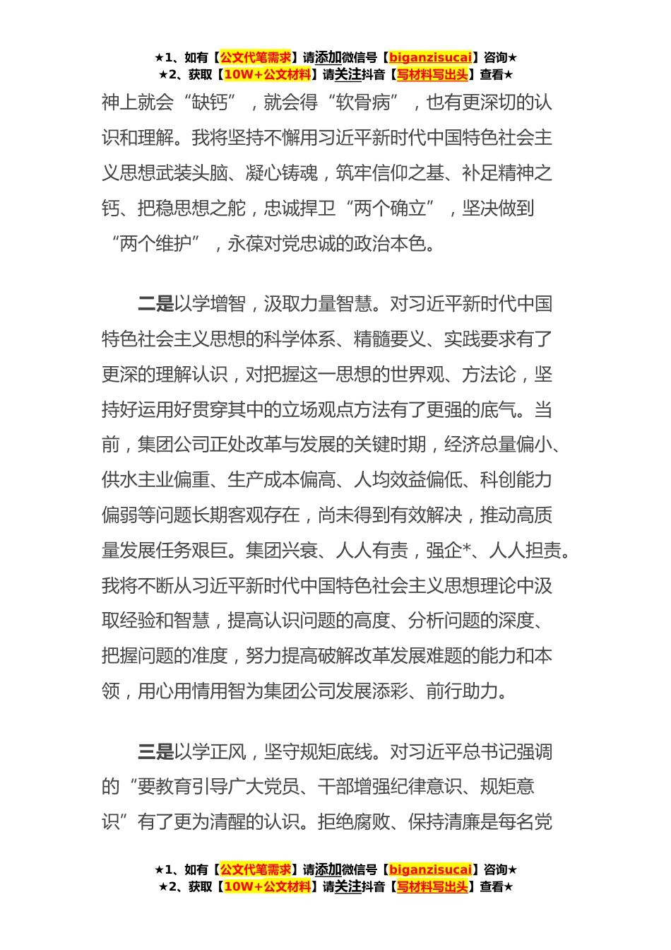 ★1、如有【公文代笔需求】请添加微信号【biganzisucai】咨询★★2、获取【10W+公文材料】请关注抖音【写材料写出头】查看★在集团公司主题教育读书班交流发言以县处级以上领导干部为重点在全党深入开展学习贯彻习近平新时代中国特色社会主义思想主题教育,是党中央贯彻落实党的XX大精神作出的重大部署,是统一全党思想、解决党内存在的突出问题、始终保持党同人民群众血肉联系、推动党和国家事业发展的重要举措。参加集团公司这次主题教育读书班,通过为期*的专题学习,系统学习习近平新时代中国特色社会主义思想,深刻领悟新时代马克思主义真理的力量,更加凝聚了奋进的力量,更加坚定了工作的方向。我将牢牢把握总要求,切实将学习成果转化为立足岗位、履职尽责的支撑能力,为推动集团公司更高质量更快速度发展...