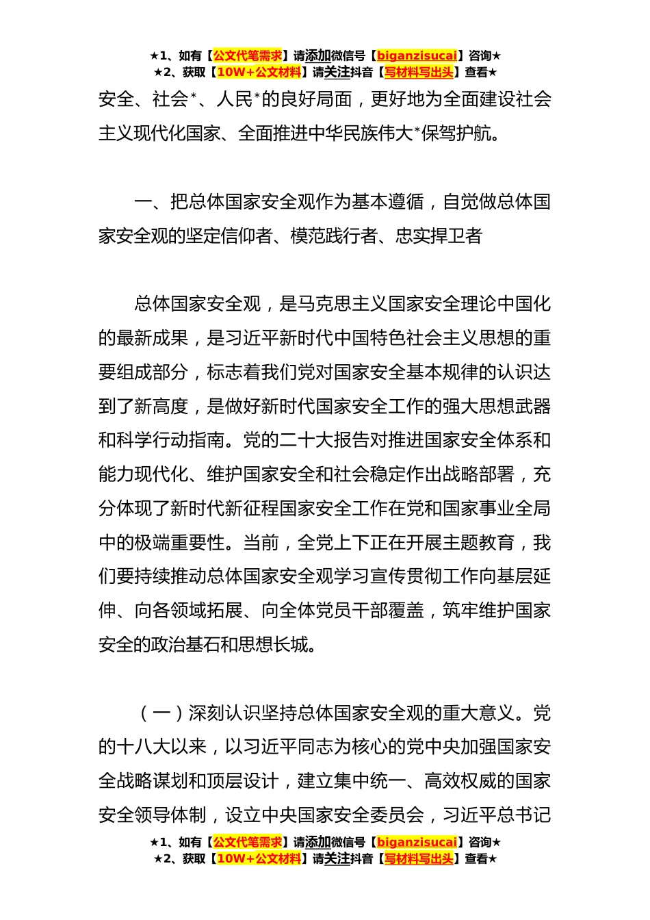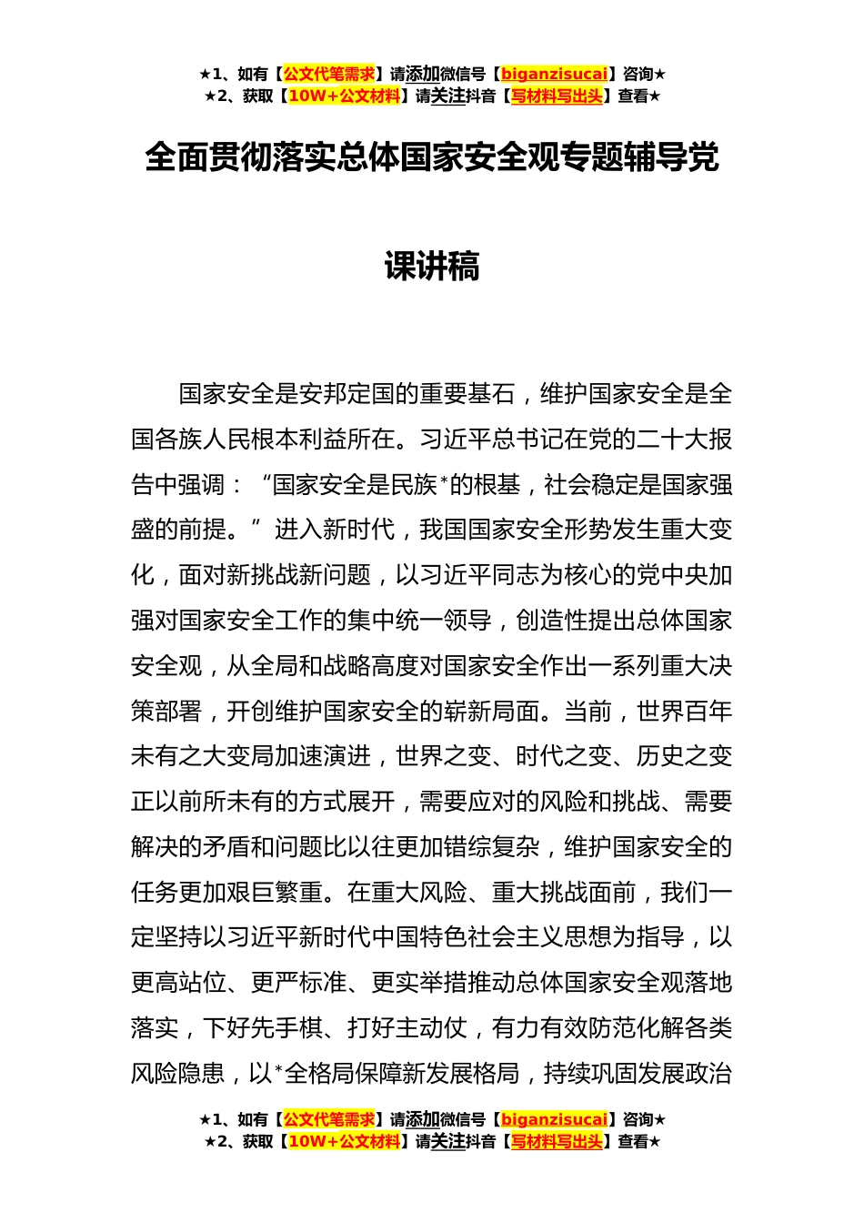 ★1、如有【公文代笔需求】请添加微信号【biganzisucai】咨询★★2、获取【10W+公文材料】请关注抖音【写材料写出头】查看★全面贯彻落实总体国家安全观专题辅导党课讲稿国家安全是安邦定国的重要基石,维护国家安全是全国各族人民根本利益所在。习近平总书记在党的二十大报告中强调:“国家安全是民族*的根基,社会稳定是国家强盛的前提。”进入新时代,我国国家安全形势发生重大变化,面对新挑战新问题,以习近平同志为核心的党中央加强对国家安全工作的集中统一领导,创造性提出总体国家安全观,从全局和战略高度对国家安全作出一系列重大决策部署,开创维护国家安全的崭新局面。当前,世界百年未有之大变局加速演进,世界之变、时代之变、历史之变正以前所未有的方式展开,需要应对的风险和挑战、需要解决的矛...