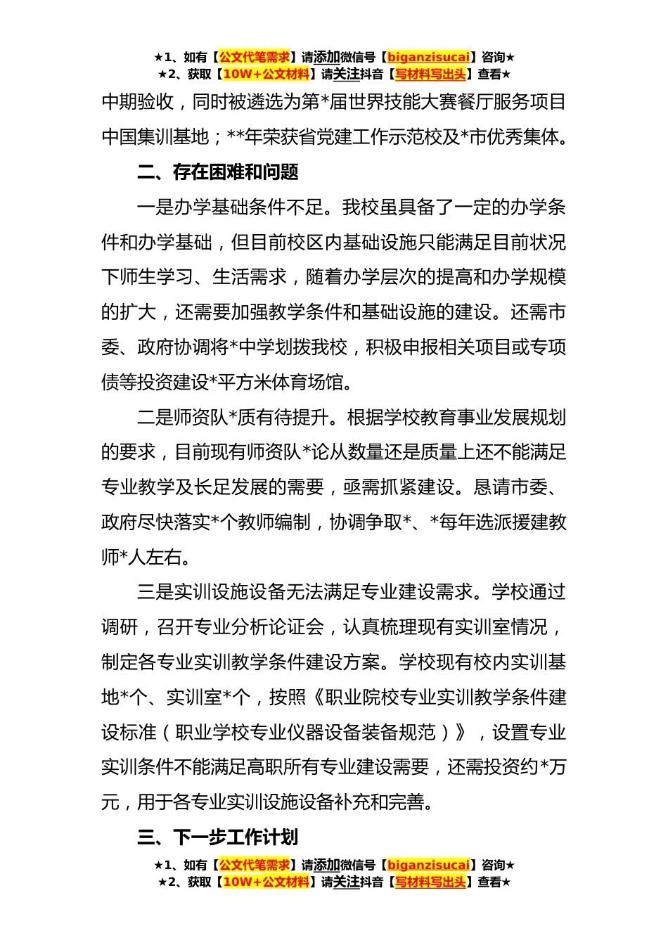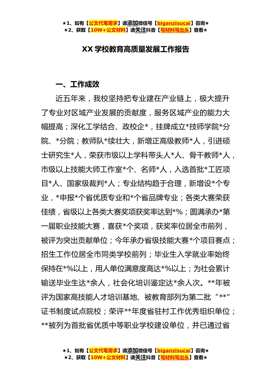 ★1、如有【公文代笔需求】请添加微信号【biganzisucai】咨询★★2、获取【10W+公文材料】请关注抖音【写材料写出头】查看★XX学校教育高质量发展工作报告一、工作成效近五年来,我校坚持把专业建在产业链上,极大提升了专业对区域产业发展的贡献度,服务区域产业的能力大幅提高;深化工学结合、政校企*,挂牌成立*技师学院*分院、*分院;教师队*续壮大,新增正高级教师*人,引进硕士研究生*人,荣获市级以上学科带头人*人、骨干教师*人,市级以上技能大师工作室*个、名师*人,入选首批*工匠项目*人、国家级裁判*人;专业结构趋于合理,新增设*个专业,*申报*个省优质专业和*个省品牌专业;各类大赛荣获佳绩,省级以上各类大赛奖项获奖率达到*%;圆满承办*第一届职业技能大赛,喜获*个奖项,获奖率位居全市前列,...