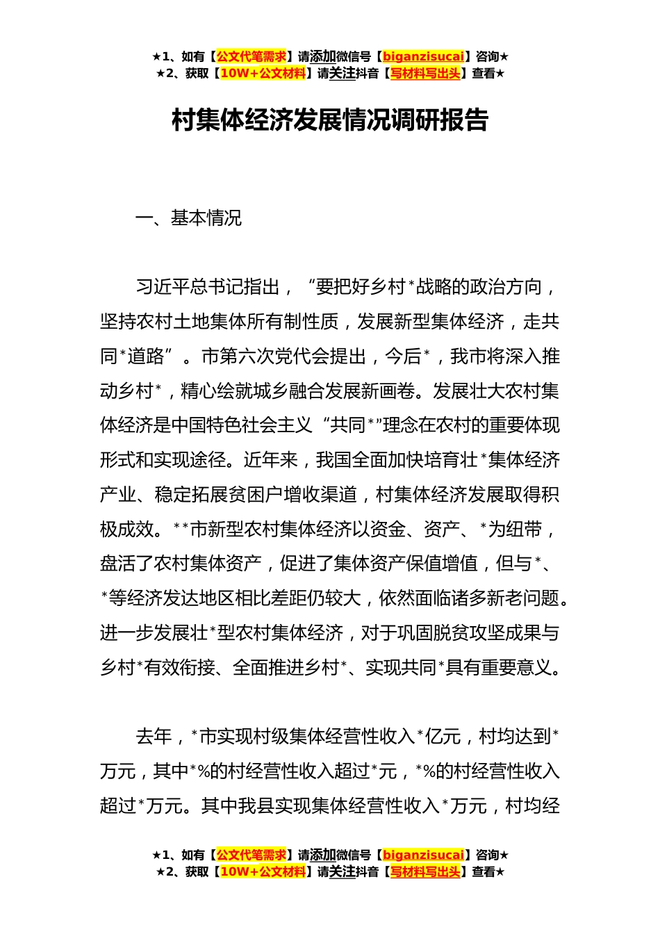 ★1、如有【公文代笔需求】请添加微信号【biganzisucai】咨询★★2、获取【10W+公文材料】请关注抖音【写材料写出头】查看★村集体经济发展情况调研报告一、基本情况习近平总书记指出,“要把好乡村*战略的政治方向,坚持农村土地集体所有制性质,发展新型集体经济,走共同*道路”。市第六次党代会提出,今后*,我市将深入推动乡村*,精心绘就城乡融合发展新画卷。发展壮大农村集体经济是中国特色社会主义“共同*”理念在农村的重要体现形式和实现途径。近年来,我国全面加快培育壮*集体经济产业、稳定拓展贫困户增收渠道,村集体经济发展取得积极成效。**市新型农村集体经济以资金、资产、*为纽带,盘活了农村集体资产,促进了集体资产保值增值,但与*、*等经济发达地区相比差距仍较大,依然面临诸多新老问题。进...