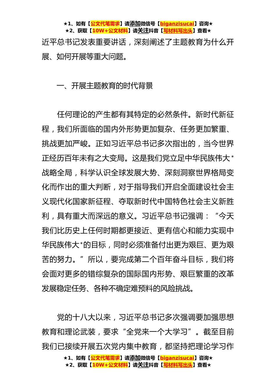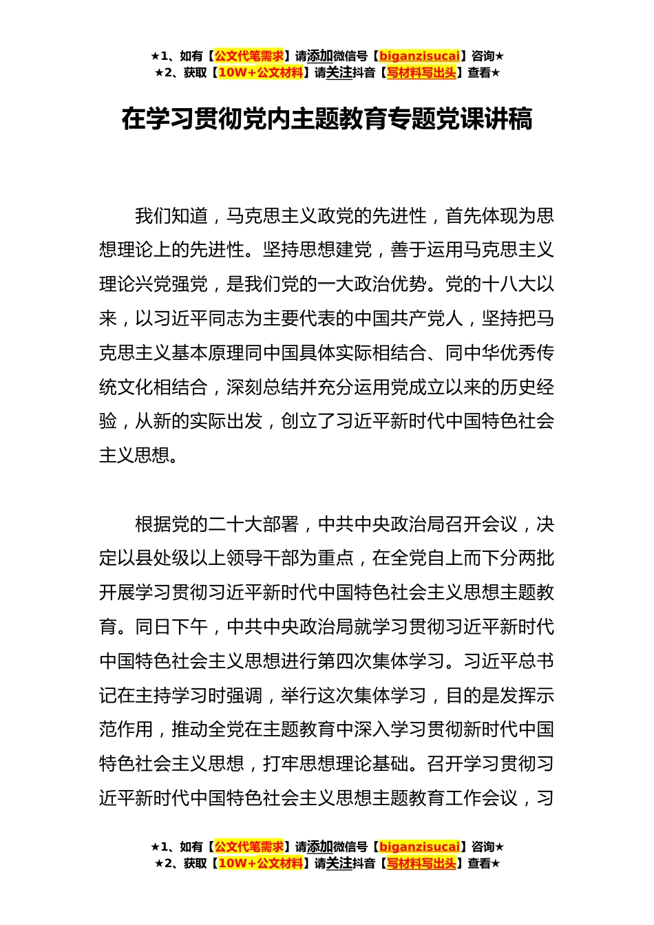 ★1、如有【公文代笔需求】请添加微信号【biganzisucai】咨询★★2、获取【10W+公文材料】请关注抖音【写材料写出头】查看★在学习贯彻党内主题教育专题党课讲稿我们知道,马克思主义政党的先进性,首先体现为思想理论上的先进性。坚持思想建党,善于运用马克思主义理论兴党强党,是我们党的一大政治优势。党的十八大以来,以习近平同志为主要代表的中国共产党人,坚持把马克思主义基本原理同中国具体实际相结合、同中华优秀传统文化相结合,深刻总结并充分运用党成立以来的历史经验,从新的实际出发,创立了习近平新时代中国特色社会主义思想。根据党的二十大部署,中共中央政治局召开会议,决定以县处级以上领导干部为重点,在全党自上而下分两批开展学习贯彻习近平新时代中国特色社会主义思想主题教育。同日下...