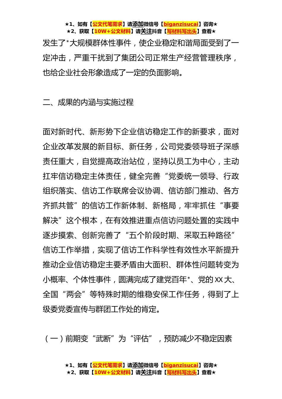 ★1、如有【公文代笔需求】请添加微信号【biganzisucai】咨询★★2、获取【10W+公文材料】请关注抖音【写材料写出头】查看★在化解集访经验中提升信访工作科学性有效性的途径一、成果产生的背景长期以来,信访工作是党的群众工作的重要组成部分,是了解社情民意的重要窗口,在各阶段、各时期、各方面发挥了“稳压器”“晴雨表”“联心桥”的作用。近平总书记曾强调:信访是“送上门来的群众工作”,是各级领导干部及工作人员接受群众监督、改进工作作风的重要途径要深入研究和准确把握新形势下群众工作的特点和规律,改进群众工作方法,提高群众工作水平。公司在为国家改革发展做出突出贡献的同时,随着不同历史阶段改革不断深化,特别是管理机制的重大变革,一些原本长期积累的矛盾想化解没有法律依据,导致任何...