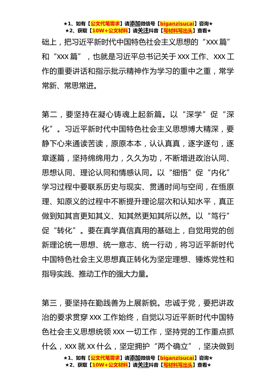 ★1、如有【公文代笔需求】请添加微信号【biganzisucai】咨询★★2、获取【10W+公文材料】请关注抖音【写材料写出头】查看★**年*主题教育暨理论学习中心组研讨发言材料习近平新时代中国特色社会主义思想是我们奋进新征程的思想指*行动纲领,我们要严格落实好主题教育工作部署,把学好用好这一重要思想作为重大政治任务抓紧抓实抓好。第一,要坚持在深学细悟上开新局。从整体把握。习近平新时代中国特色社会主义思想是当代中国马克思主义,是*纪马克思主义,是中华文化和中国精神的时代精华,实现了马克思主义中国化新的飞跃。这是我们在学习中要把握的一条主线,这样才能确保学习方向不跑偏。从体系领悟习近平新时代中国特色社会主义思想是一个系统全面、逻辑严密、内涵丰富、内在统一的科学理论体系,“*+*+*...