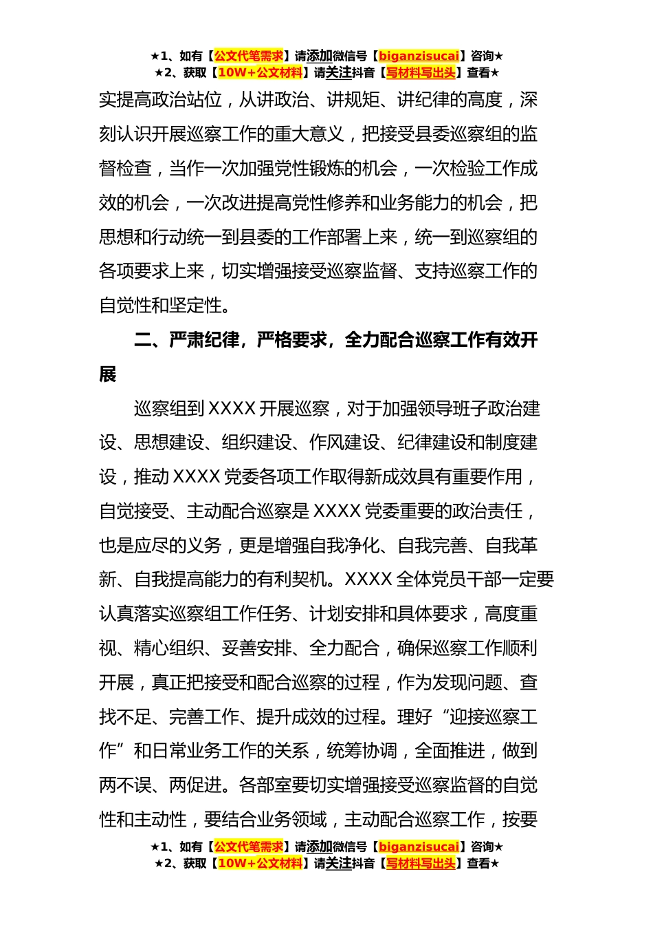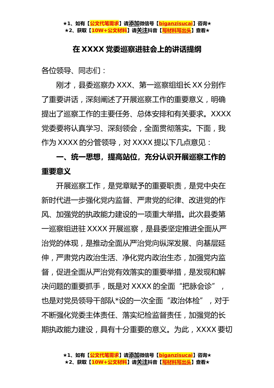 ★1、如有【公文代笔需求】请添加微信号【biganzisucai】咨询★★2、获取【10W+公文材料】请关注抖音【写材料写出头】查看★在XXXX党委巡察进驻会上的讲话提纲各位领导、同志们:刚才,县委巡察办XXX、第一巡察组组长XX分别作了重要讲话,深刻阐述了开展巡察工作的重要意义,明确提出了巡察工作的主要任务、总体安排和有关要求。XXXX党委要将认真学习、深刻领会,全面贯彻落实。下面,我作为XXXX的分管领导,对XXXX提以下几点意见:一、统一思想,提高站位,充分认识开展巡察工作的重要意义开展巡察工作,是党章赋予的重要职责,是党中央在新时代进一步强化党内监督、严肃党的纪律、改进党的作风、加强党的执政能力建设的一项重大举措。此次县委第一巡察组进驻XXXX开展巡察,是县委坚定推进全面从严治党的体现,是...