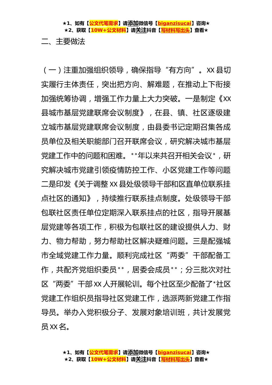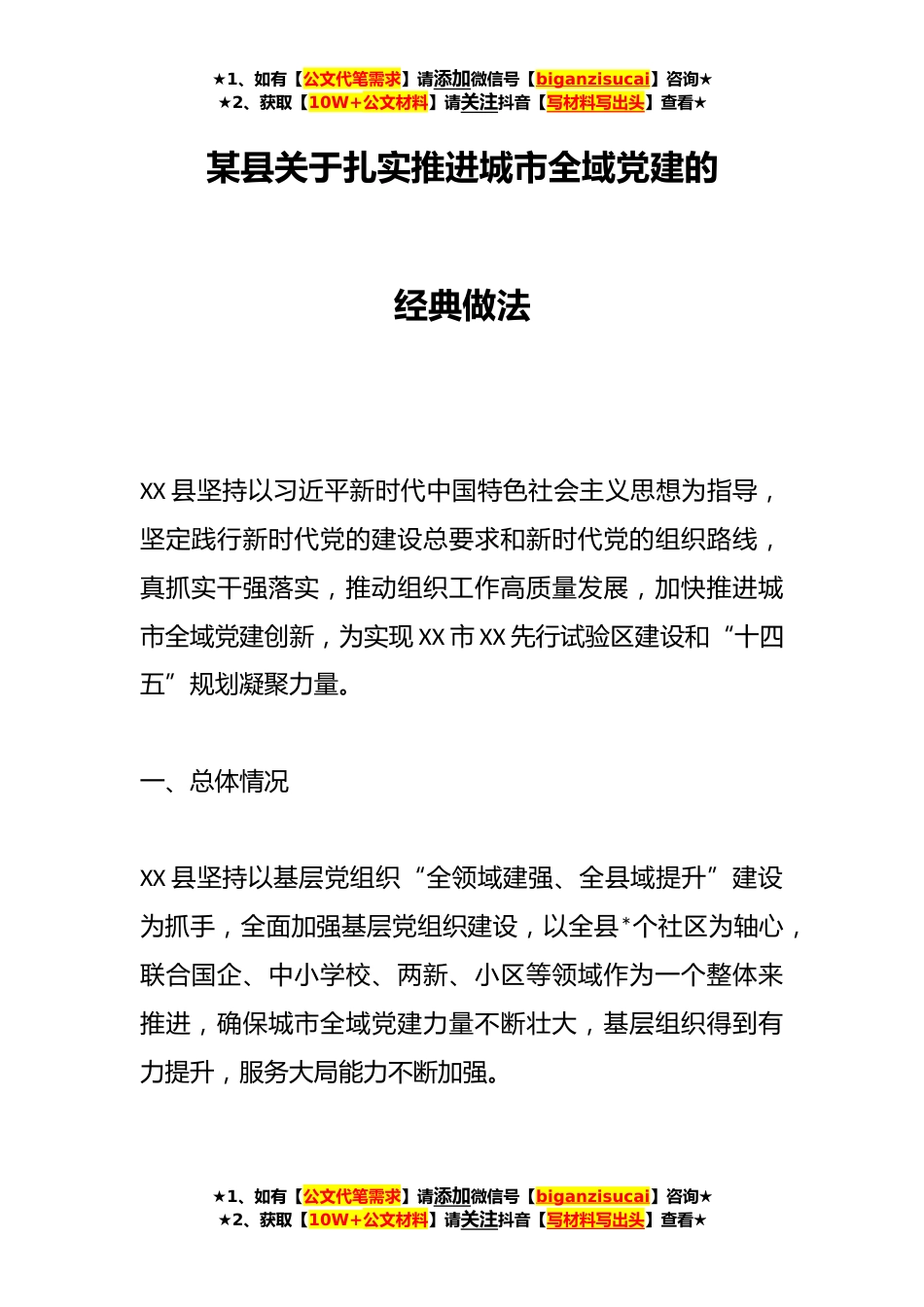 ★1、如有【公文代笔需求】请添加微信号【biganzisucai】咨询★★2、获取【10W+公文材料】请关注抖音【写材料写出头】查看★某县关于扎实推进城市全域党建的经典做法XX县坚持以习近平新时代中国特色社会主义思想为指导,坚定践行新时代党的建设总要求和新时代党的组织路线,真抓实干强落实,推动组织工作高质量发展,加快推进城市全域党建创新,为实现XX市XX先行试验区建设和“十四五”规划凝聚力量。一、总体情况XX县坚持以基层党组织“全领域建强、全县域提升”建设为抓手,全面加强基层党组织建设,以全县*个社区为轴心,联合国企、中小学校、两新、小区等领域作为一个整体来推进,确保城市全域党建力量不断壮大,基层组织得到有力提升,服务大局能力不断加强。★1、如有【公文代笔需求】请添加微信号【biganzi...