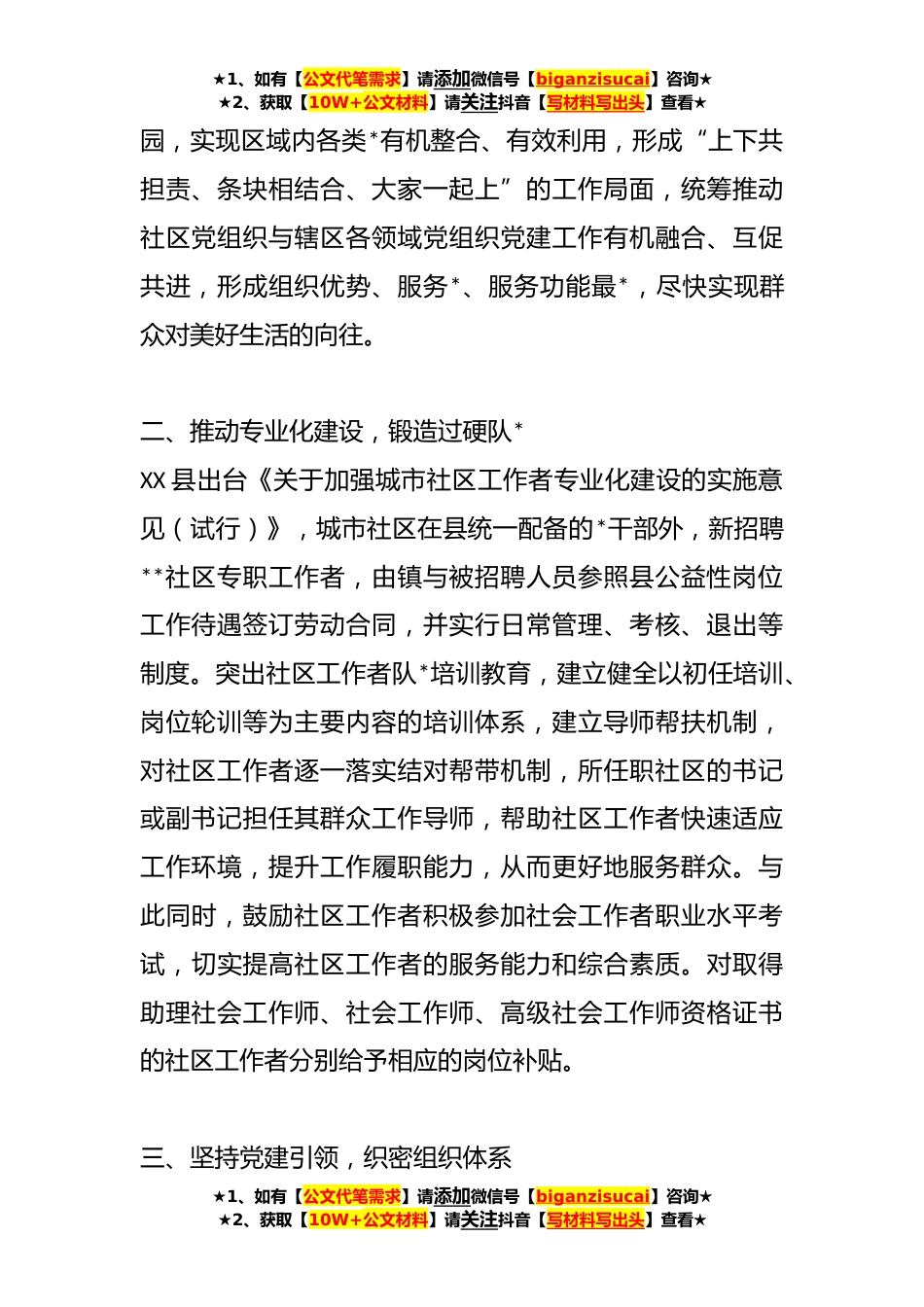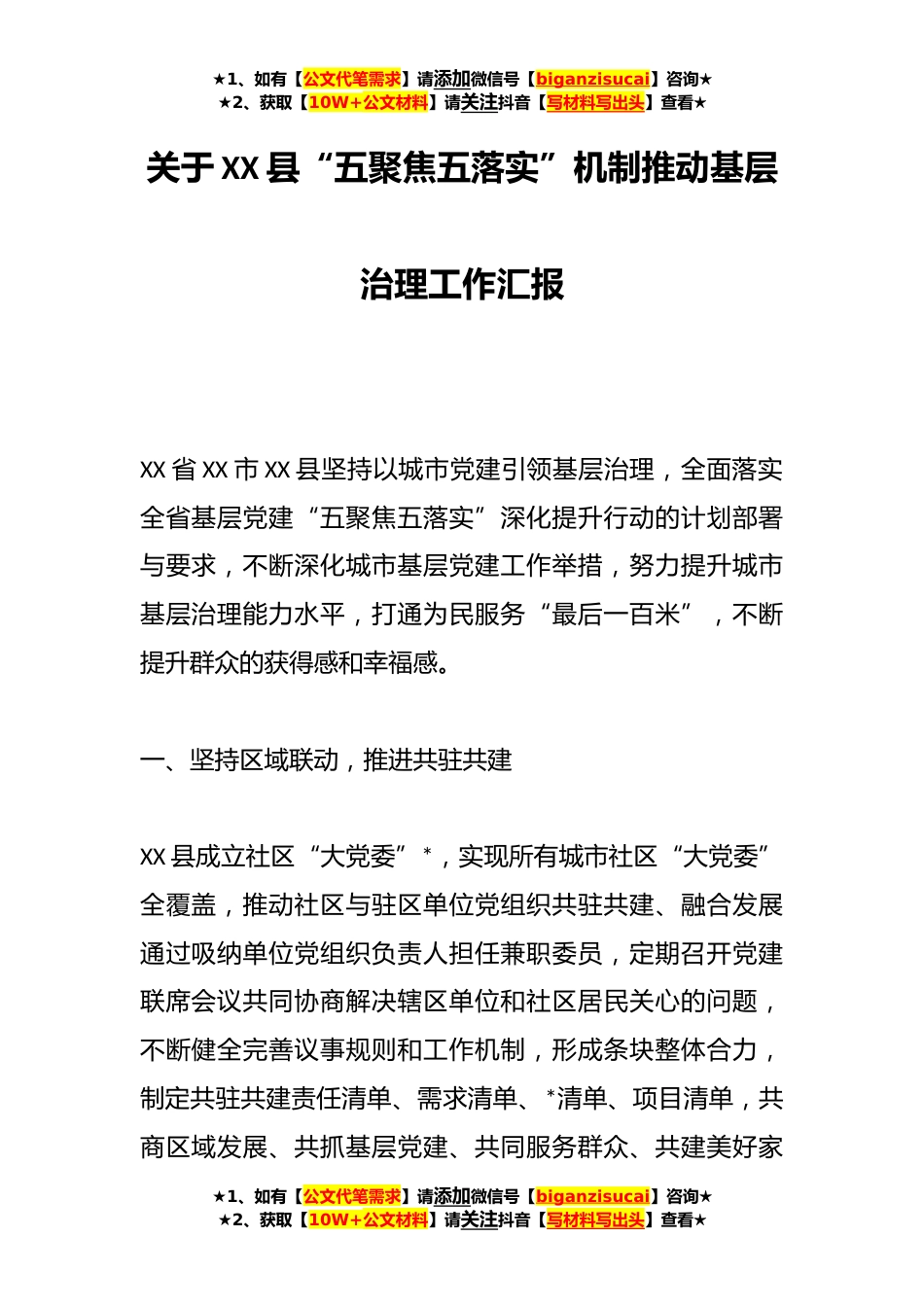 ★1、如有【公文代笔需求】请添加微信号【biganzisucai】咨询★★2、获取【10W+公文材料】请关注抖音【写材料写出头】查看★关于XX县“五聚焦五落实”机制推动基层治理工作汇报XX省XX市XX县坚持以城市党建引领基层治理,全面落实全省基层党建“五聚焦五落实”深化提升行动的计划部署与要求,不断深化城市基层党建工作举措,努力提升城市基层治理能力水平,打通为民服务“最后一百米”,不断提升群众的获得感和幸福感。一、坚持区域联动,推进共驻共建XX县成立社区“大党委”*,实现所有城市社区“大党委”全覆盖,推动社区与驻区单位党组织共驻共建、融合发展通过吸纳单位党组织负责人担任兼职委员,定期召开党建联席会议共同协商解决辖区单位和社区居民关心的问题,不断健全完善议事规则和工作机制,形成条块整体...