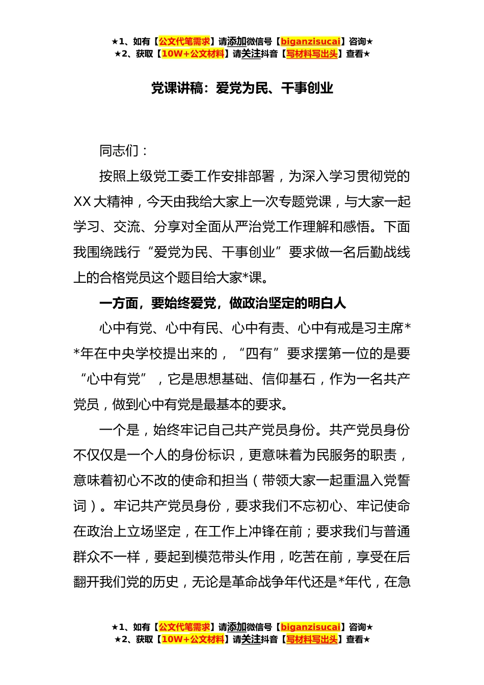 ★1、如有【公文代笔需求】请添加微信号【biganzisucai】咨询★★2、获取【10W+公文材料】请关注抖音【写材料写出头】查看★党课讲稿:爱党为民、干事创业同志们:按照上级党工委工作安排部署,为深入学习贯彻党的XX大精神,今天由我给大家上一次专题党课,与大家一起学习、交流、分享对全面从严治党工作理解和感悟。下面我围绕践行“爱党为民、干事创业”要求做一名后勤战线上的合格党员这个题目给大家*课。一方面,要始终爱党,做政治坚定的明白人心中有党、心中有民、心中有责、心中有戒是习主席**年在中央学校提出来的,“四有”要求摆第一位的是要“心中有党”,它是思想基础、信仰基石,作为一名共产党员,做到心中有党是最基本的要求。一个是,始终牢记自己共产党员身份。共产党员身份不仅仅是一个人的身份...