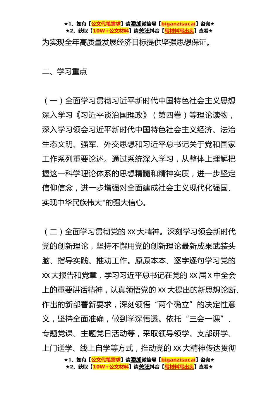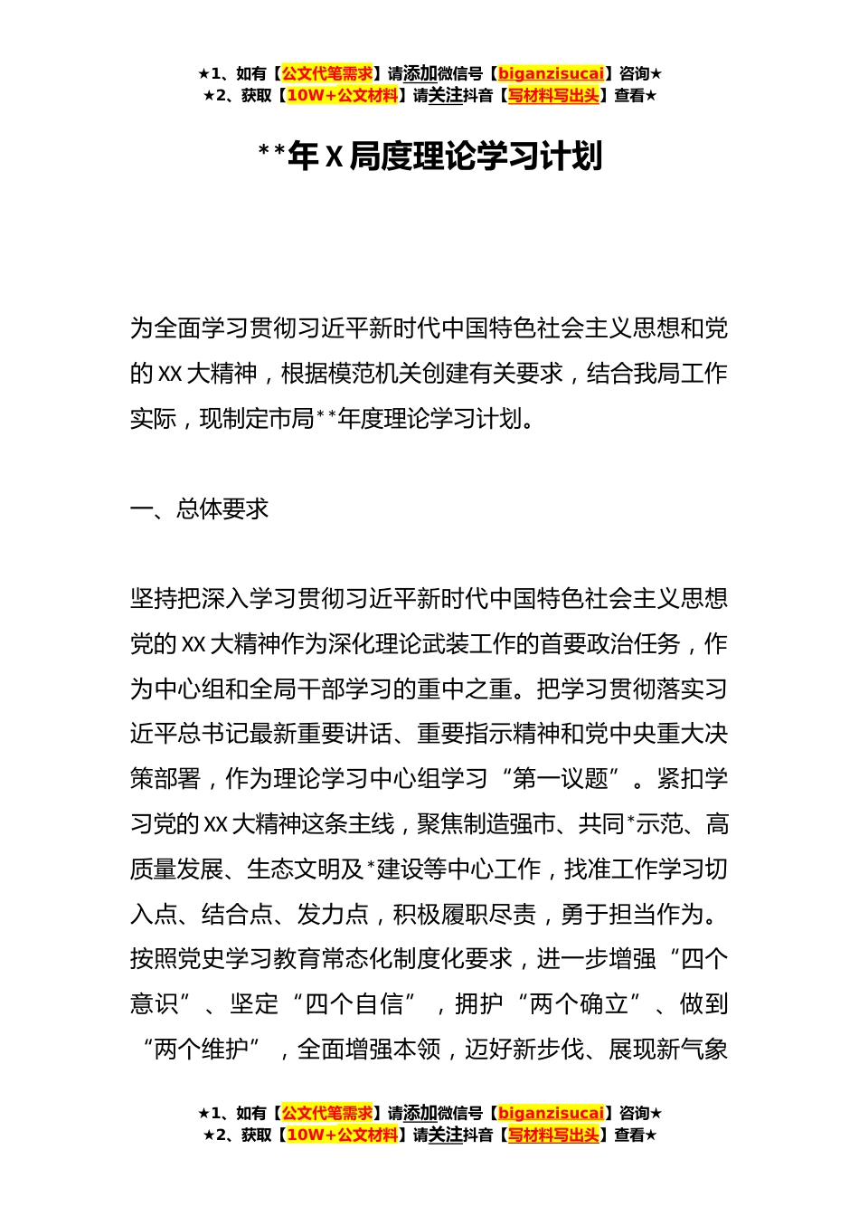 ★1、如有【公文代笔需求】请添加微信号【biganzisucai】咨询★★2、获取【10W+公文材料】请关注抖音【写材料写出头】查看★**年X局度理论学习计划为全面学习贯彻习近平新时代中国特色社会主义思想和党的XX大精神,根据模范机关创建有关要求,结合我局工作实际,现制定市局**年度理论学习计划。一、总体要求坚持把深入学习贯彻习近平新时代中国特色社会主义思想党的XX大精神作为深化理论武装工作的首要政治任务,作为中心组和全局干部学习的重中之重。把学习贯彻落实习近平总书记最新重要讲话、重要指示精神和党中央重大决策部署,作为理论学习中心组学习“第一议题”。紧扣学习党的XX大精神这条主线,聚焦制造强市、共同*示范、高质量发展、生态文明及*建设等中心工作,找准工作学习切入点、结合点、发力点,积极...