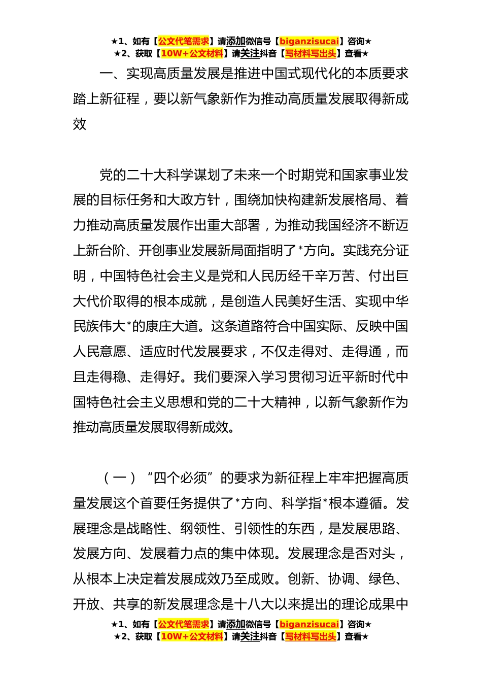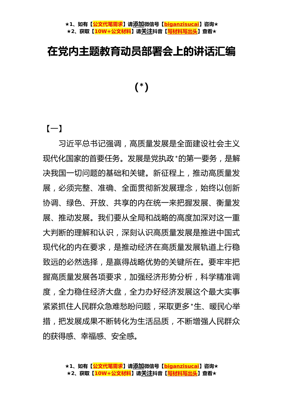 ★1、如有【公文代笔需求】请添加微信号【biganzisucai】咨询★★2、获取【10W+公文材料】请关注抖音【写材料写出头】查看★在党内主题教育动员部署会上的讲话汇编(*)【一】习近平总书记强调,高质量发展是全面建设社会主义现代化国家的首要任务。发展是党执政*的第一要务,是解决我国一切问题的基础和关键。新征程上,推动高质量发展,必须完整、准确、全面贯彻新发展理念,始终以创新协调、绿色、开放、共享的内在统一来把握发展、衡量发展、推动发展。我们要从全局和战略的高度加深对这一重大判断的理解和认识,深刻认识高质量发展是推进中国式现代化的内在要求,是推动经济在高质量发展轨道上行稳致远的必然选择,是赢得战略优势的关键所在。要牢牢把握高质量发展各项要求,加强经济形势分析,科学精准调度...