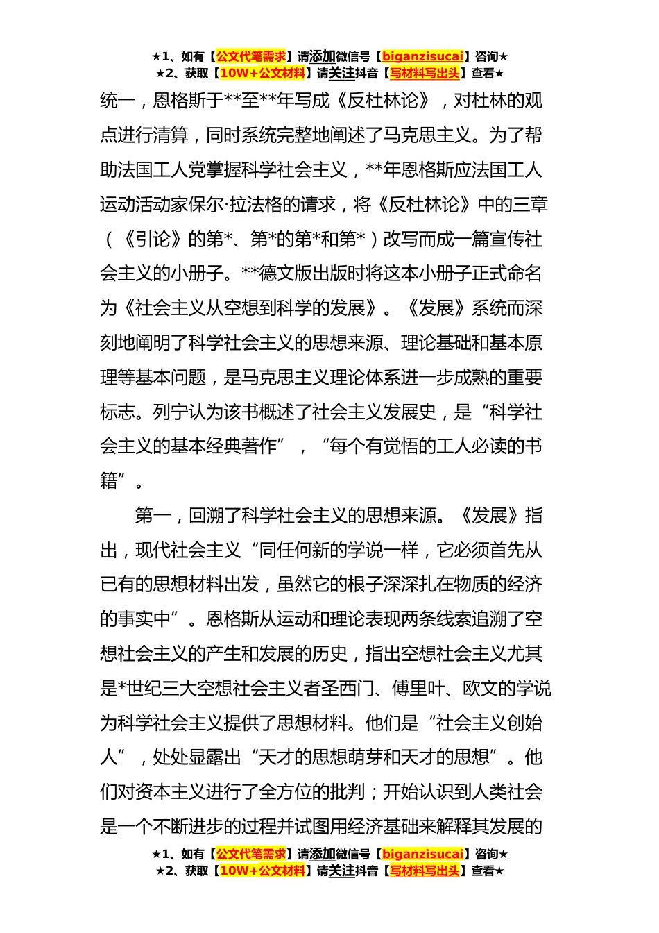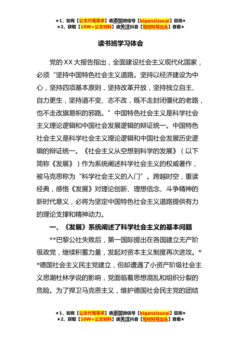 ★1、如有【公文代笔需求】请添加微信号【biganzisucai】咨询★★2、获取【10W+公文材料】请关注抖音【写材料写出头】查看★读书班学习体会党的XX大报告指出,全面建设社会主义现代化国家,必须“坚持中国特色社会主义道路。坚持以经济建设为中心,坚持四项基本原则,坚持改革开放,坚持独立自主、自力更生,坚持道不变、志不改,既不走封闭僵化的老路,也不走改旗易帜的邪路。”中国特色社会主义是科学社会主义理论逻辑和中国社会发展逻辑的辩证统一。中国特色社会主义是科学社会主义理论逻辑和中国社会发展历史逻辑的辩证统一。《社会主义从空想到科学的发展》(以下简称《发展》)作为系统阐述科学社会主义的权威著作,被马克思称为“科学社会主义的入门”。跨越时空,重读经典,感悟《发展》对理论创新、理想...