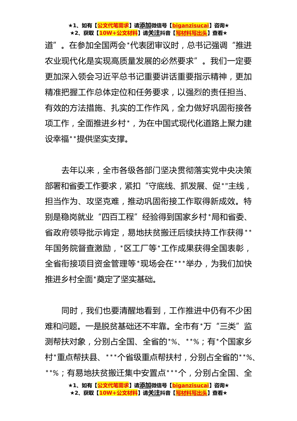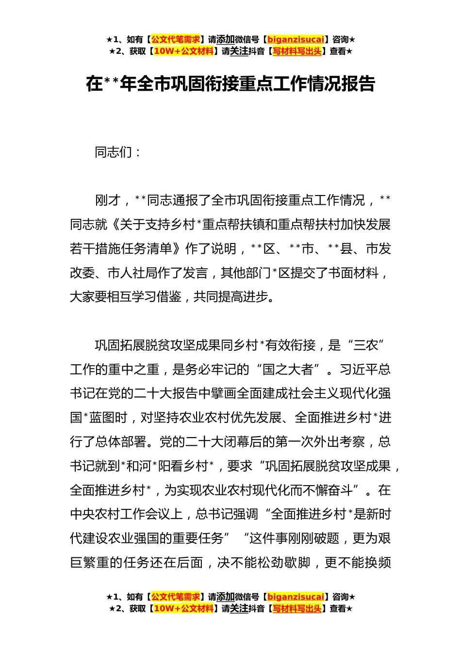 ★1、如有【公文代笔需求】请添加微信号【biganzisucai】咨询★★2、获取【10W+公文材料】请关注抖音【写材料写出头】查看★在**年全市巩固衔接重点工作情况报告同志们:刚才,**同志通报了全市巩固衔接重点工作情况,**同志就《关于支持乡村*重点帮扶镇和重点帮扶村加快发展若干措施任务清单》作了说明,**区、**市、**县、市发改委、市人社局作了发言,其他部门*区提交了书面材料,大家要相互学习借鉴,共同提高进步。巩固拓展脱贫攻坚成果同乡村*有效衔接,是“三农”工作的重中之重,是务必牢记的“国之大者”。习近平总书记在党的二十大报告中擘画全面建成社会主义现代化强国*蓝图时,对坚持农业农村优先发展、全面推进乡村*进行了总体部署。党的二十大闭幕后的第一次外出考察,总书记就到*和河*阳看乡村*,...