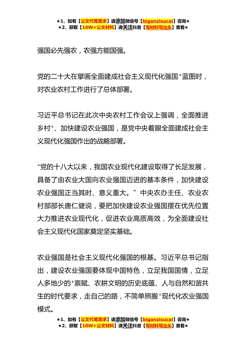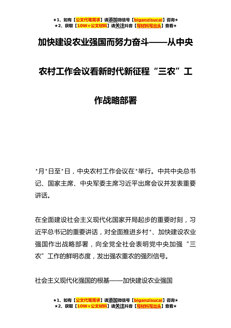 ★1、如有【公文代笔需求】请添加微信号【biganzisucai】咨询★★2、获取【10W+公文材料】请关注抖音【写材料写出头】查看★加快建设农业强国而努力奋斗——从中央农村工作会议看新时代新征程“三农”工作战略部署*月*日至*日,中央农村工作会议在*举行。中共中央总书记、国家主席、中央军委主席习近平出席会议并发表重要讲话。在全面建设社会主义现代化国家开局起步的重要时刻,习近平总书记的重要讲话,对全面推进乡村*、加快建设农业强国作出战略部署,向全党全社会表明党中央加强“三农”工作的鲜明态度,发出强农重农的强烈信号。社会主义现代化强国的根基——加快建设农业强国★1、如有【公文代笔需求】请添加微信号【biganzisucai】咨询★★2、获取【10W+公文材料】请关注抖音【写材料写出头】查看★★1、...