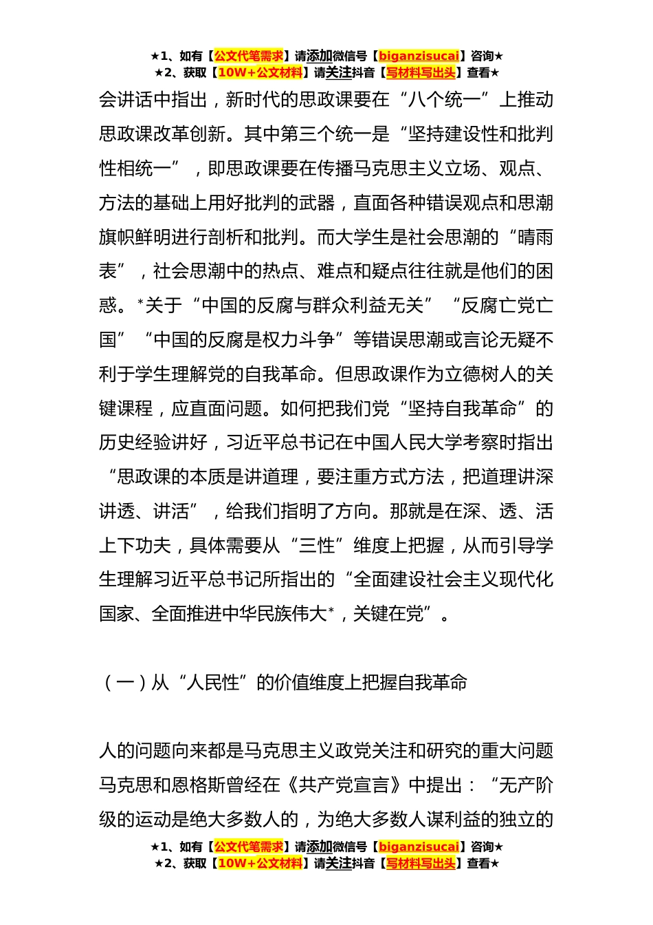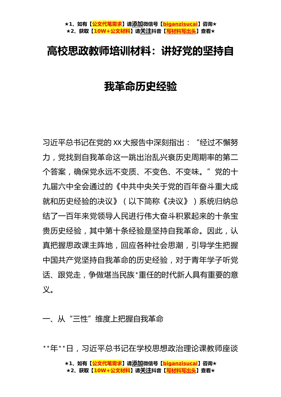 ★1、如有【公文代笔需求】请添加微信号【biganzisucai】咨询★★2、获取【10W+公文材料】请关注抖音【写材料写出头】查看★高校思政教师培训材料:讲好党的坚持自我革命历史经验习近平总书记在党的XX大报告中深刻指出:“经过不懈努力,党找到自我革命这一跳出治乱兴衰历史周期率的第二个答案,确保党永远不变质、不变色、不变味。”党的十九届六中全会通过的《中共中央关于党的百年奋斗重大成就和历史经验的决议》(以下简称《决议》)系统归纳总结了一百年来党领导人民进行伟大奋斗积累起来的十条宝贵历史经验,其中第十条经验是坚持自我革命。因此,认真把握思政课主阵地,回应各种社会思潮,引导学生把握中国共产党坚持自我革命的历史经验,对于青年学子听党话、跟党走,争做堪当民族*重任的时代新人具有重要...